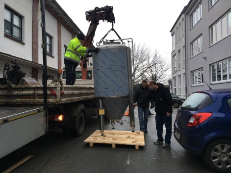 Von außen ist dem Gebäude in der Langelohe 65a nicht anzumerken, dass dort in Kürze Bier gebraut, verkauft und ausgeschenkt werden soll. Doch im Innern der Räume, die quasi neben der Fahrradbörse gelegen sind, laufen die Vorbereitungen auf Hochtouren. Gestern wurden die Brauerei-Tanks geliefert – und ich durfte bei der dramatischen Entladeaktion dabei sein.