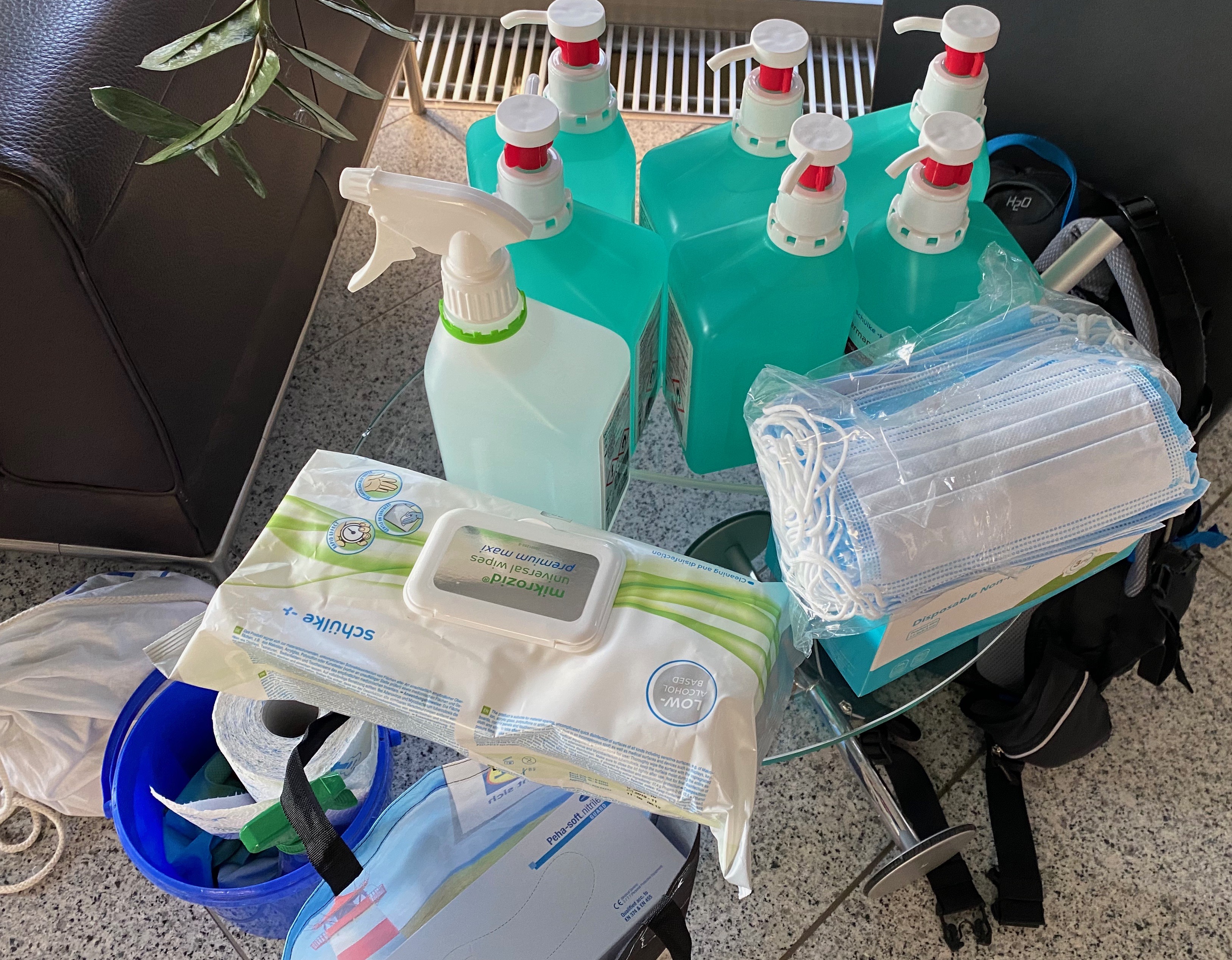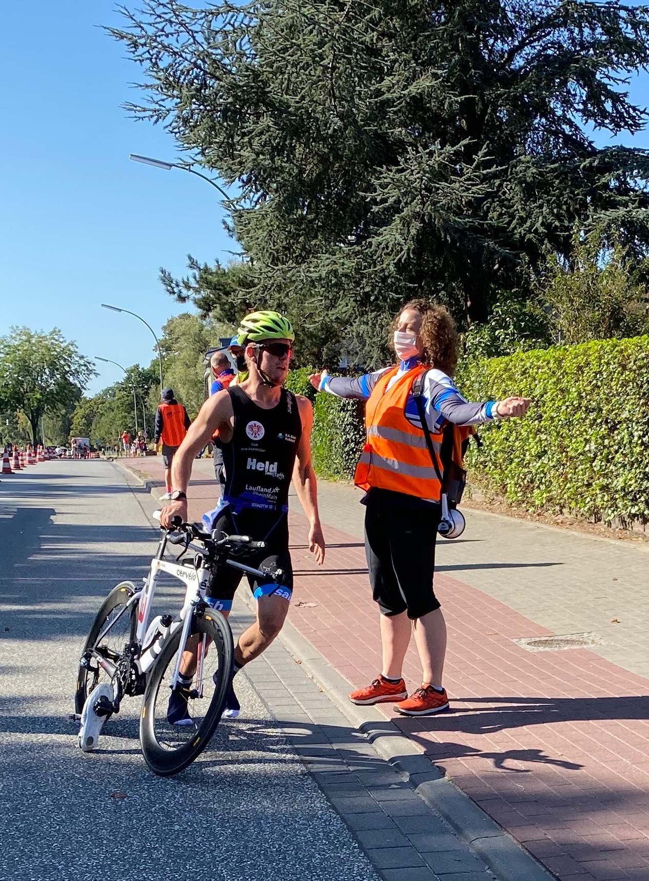 Vor dem Start war ich vor allem in der Wechselzone unterwegs, um den Athleten die versetzte Anordnung der Fahrräder in den hölzernen Ständern zu erklären. An die Maskenpflicht musste ich nur ein einziges Mal erinnern – und schwups bedeckte die Maske wieder Mund und Nase. Ganz offensichtlich haben Sportler grundsätzlich weniger Disziplinprobleme als manch andere Zeitgenossen, die sich permanent über Regeln hinwegsetzen und sich deshalb für besonders freiheitlich halten… 🙂 Nach dem Start hieß es für mich: einmal die auf dem Gelände aufgestellten vier Dixie-Klos säubern. Also Putzhandschuhe übergestreift, mit Sprühdesinfektion bewaffnet und einmal alle Klobrillen und Flächen der mobilen Toiletten abgewischt.