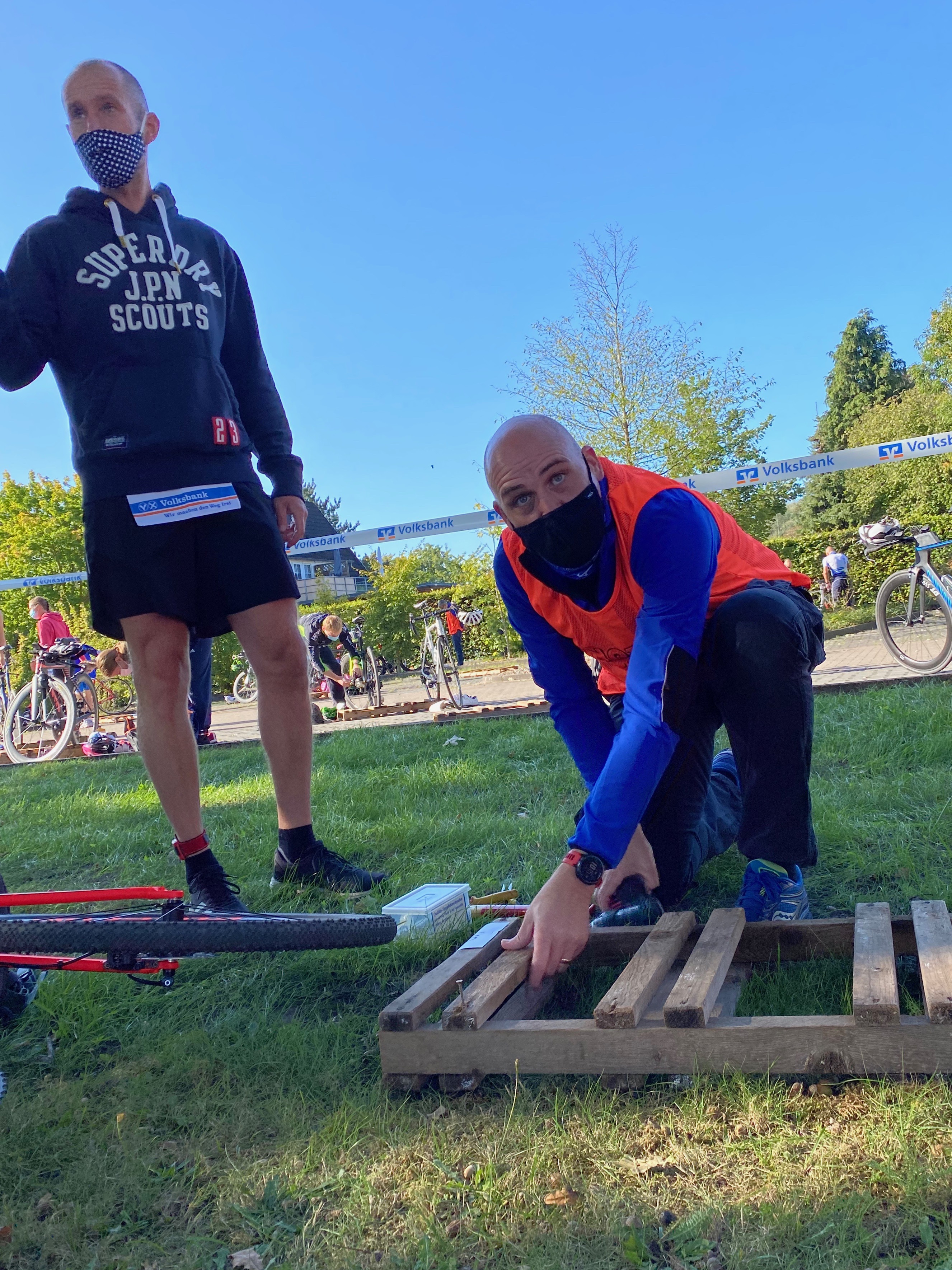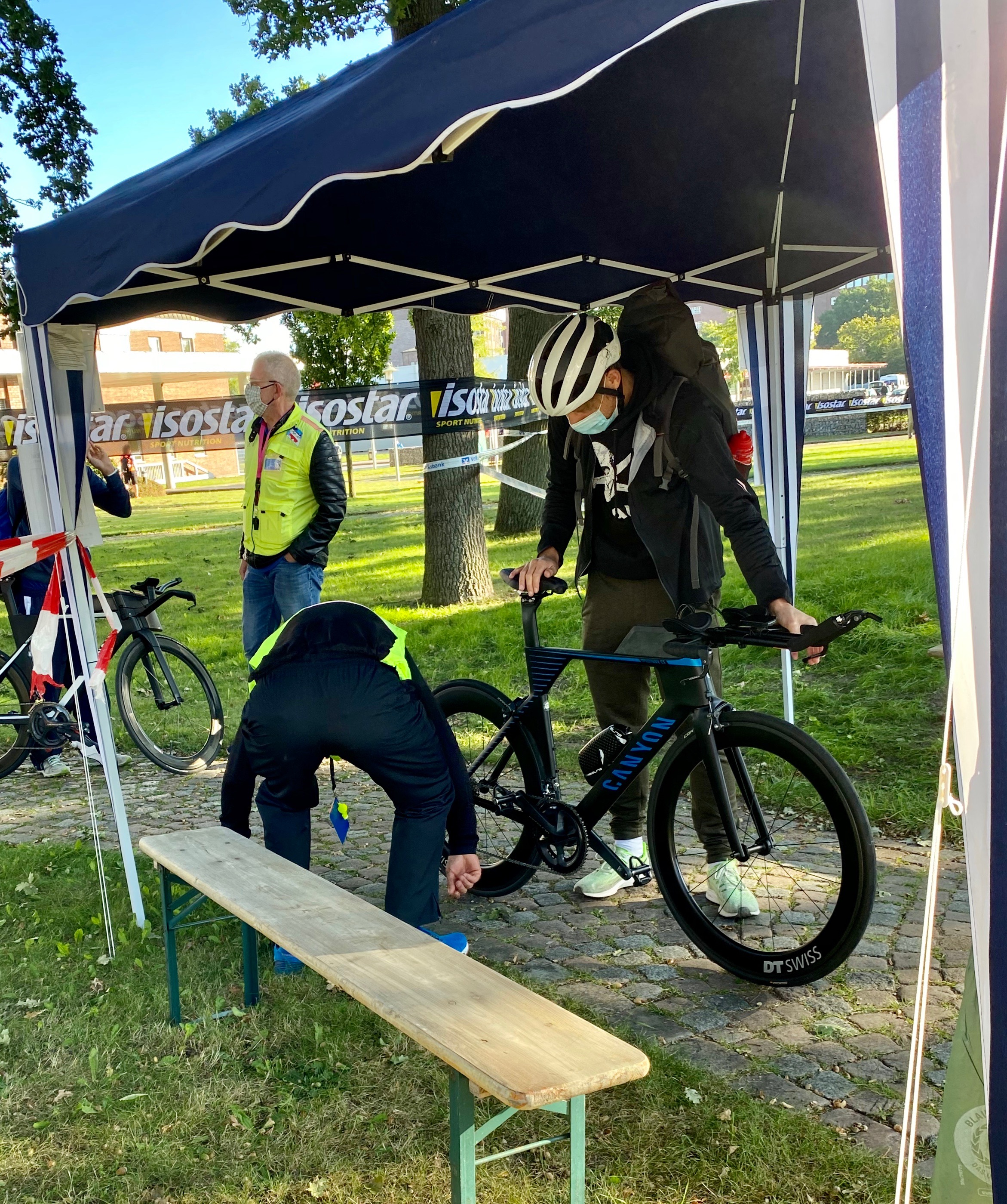 Da im Vorfeld absehbar war, dass man wegen der Corona-Besonderheiten in diesem Jahr mehr helfende Hände als sonst brauchen würde, habe ich auch mit angepackt. Also fand ich mich gestern früh um 8 Uhr zusammen mit um die 40 anderen Helfern auf dem Stadtwerke-Gelände ein, um die Wechselzone mit aufzubauen und mit Flatterband einzuzäunen. Da ich bei den Vorbereitungstreffen nicht dabei gewesen war, musste ich mich erst einmal ein wenig orientieren: Wie sind die Laufrichtungen in der Wechselzone? Wer darf wann wo rein und raus? Wo kann man die Startunterlagen abholen, wo das Rad einchecken? Zusammen mit Christoph kümmerte ich mich darum, die Startnummern an den hölzernen Ständern festzutackern. Bei 120 Teilnehmenden hieß das: 120mal in die Hocke gehen und wieder hoch – mein persönliches Oberschenkel-Training für den Tag hatte ich also gleich um 10 Uhr schon erledigt.