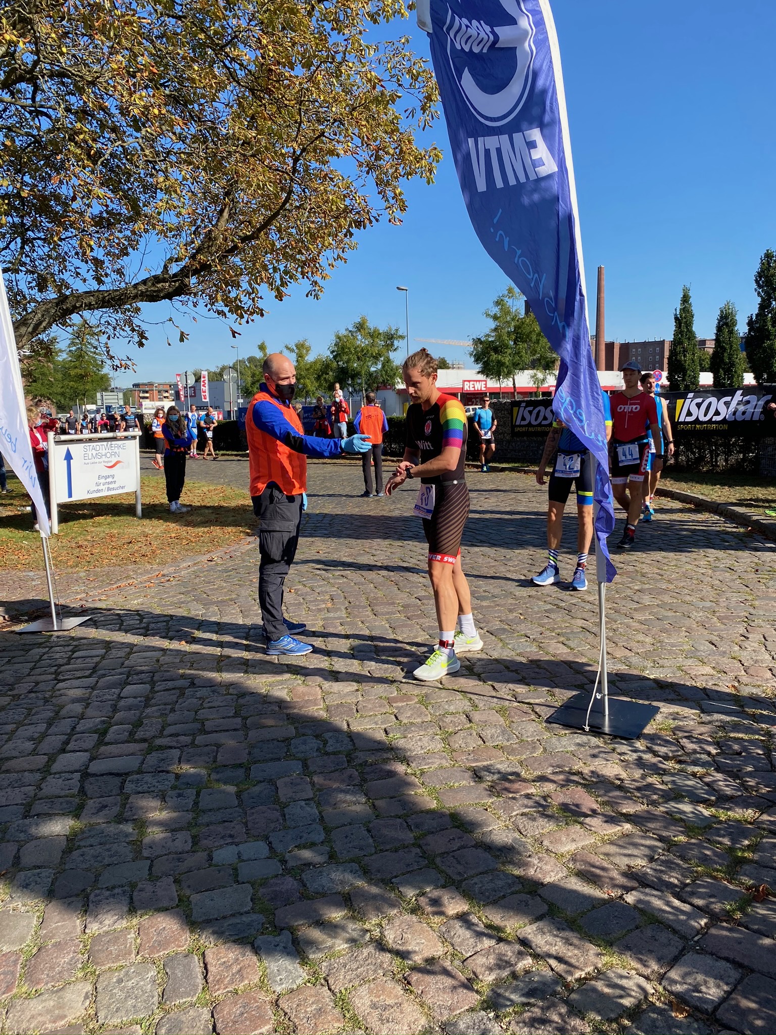Dank des versetzten Starts trudelten die Athleten tatsächlich nicht alle auf einmal, sondern mit Zeitabstand in der Wechselzone und später auch im Ziel ein. Dort wartete der nächste Job auf mich: zusammen mit zwei anderen Helfern den Sportlerinnen und Sportlern die Transponder-Chips abzunehmen, die für die Zeitnahme erforderlich sind. „Glückwunsch, tolle Leistung, darf ich dir mal kurz ans Bein fassen?“ war mein Standardspruch, wenn die Leute schweratmend im Ziel ankamen. Klettband aufreißen, Transponder entnehmen, Klettband wieder schließen, beides voneinander getrennt in eine große Ikea-Tüte werfen.