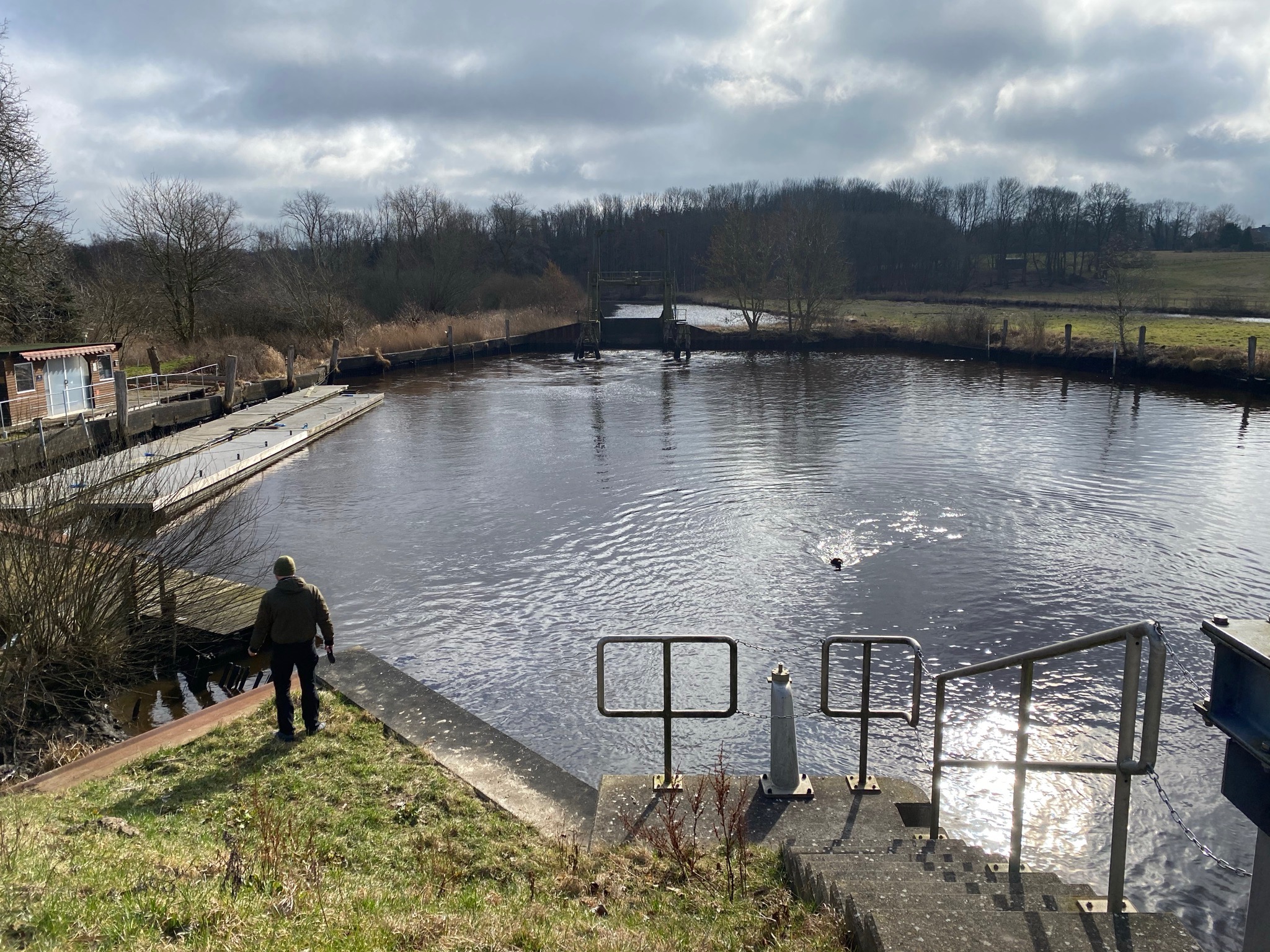 Heute setzten wir uns also ins Auto, fuhren nach Itzehoe und parkten in der Nähe des Schlosses. Spazierten zum Stördeich, inspizierten die Krümmung der Stör (sie macht an der Stelle tatsächlich quasi eine 180 Grad-Wende und erinnerte mich damit ein wenig an die Saarschleife in der Nähe des saarländischen Mettlach, die mein T9 immer zu „Haarschleife“ korrigiert, wenn ich nicht aufpasse), querte die Schleuse zum Kanal, wo gerade ein scheinbar unermüdlicher Hund sein Schwimmtraining absolvierte, wanderten am Wasser entlang, stießen auf die Laufstrecke des Störlaufs, schauten uns auf dem Gelände von Schloss Breitenburg um und schlossen die Runde um den Golfplatz. Es war ein schöner Spaziergang in toller Landschaft – und eine willkommene Abwechslung zur ewig gleichen „Denkmalrunde“ nach Raa-Besenbek, die wir sonst so oft absolvieren. Ja, man wird genügsam mit der Zeit. Aber zumindest Spaziergänge in schönen Ecken unserer Umgebung sind eigentlich immer schöne Lichtblicke im Alltag – Corona hin oder her.