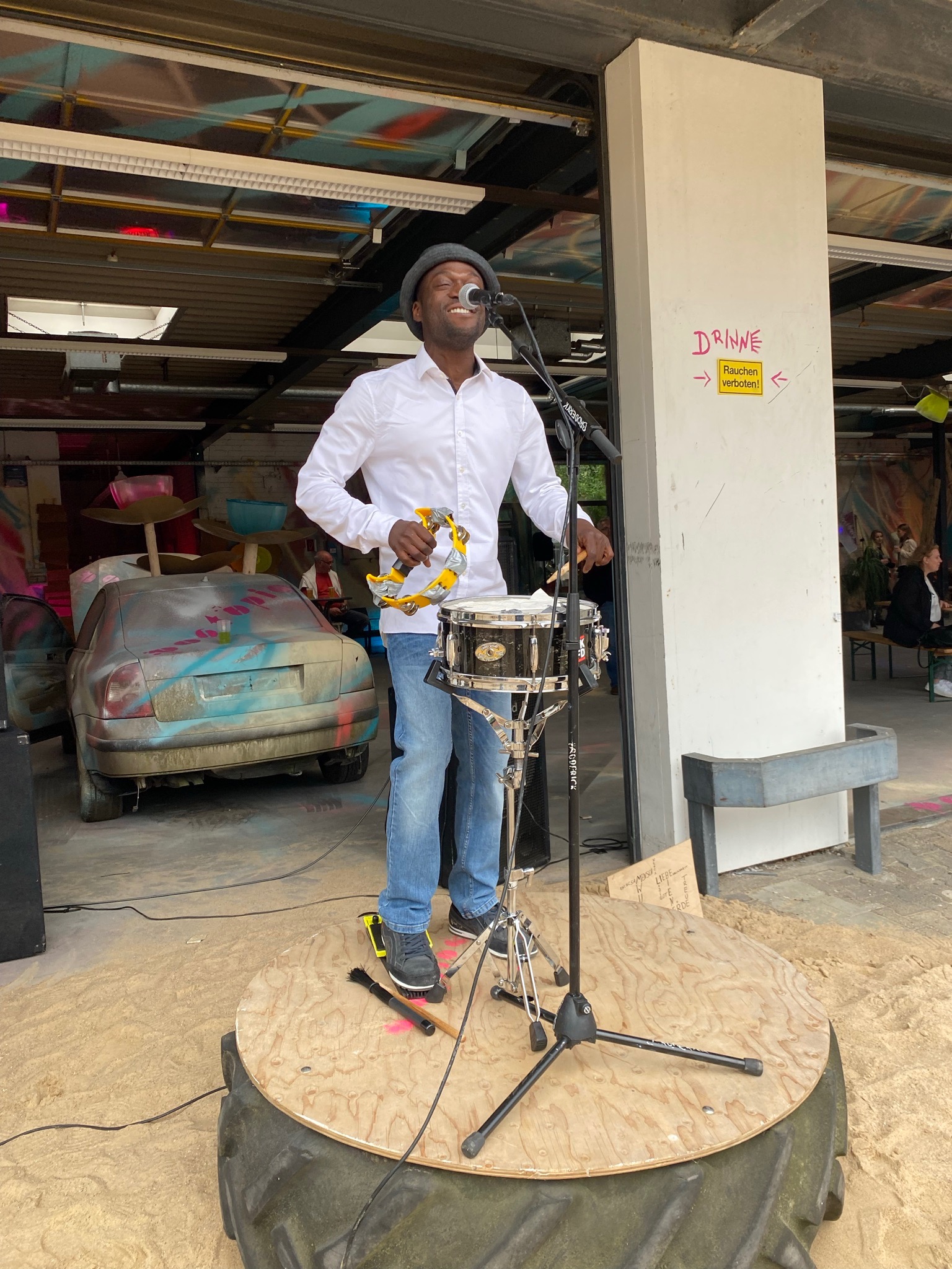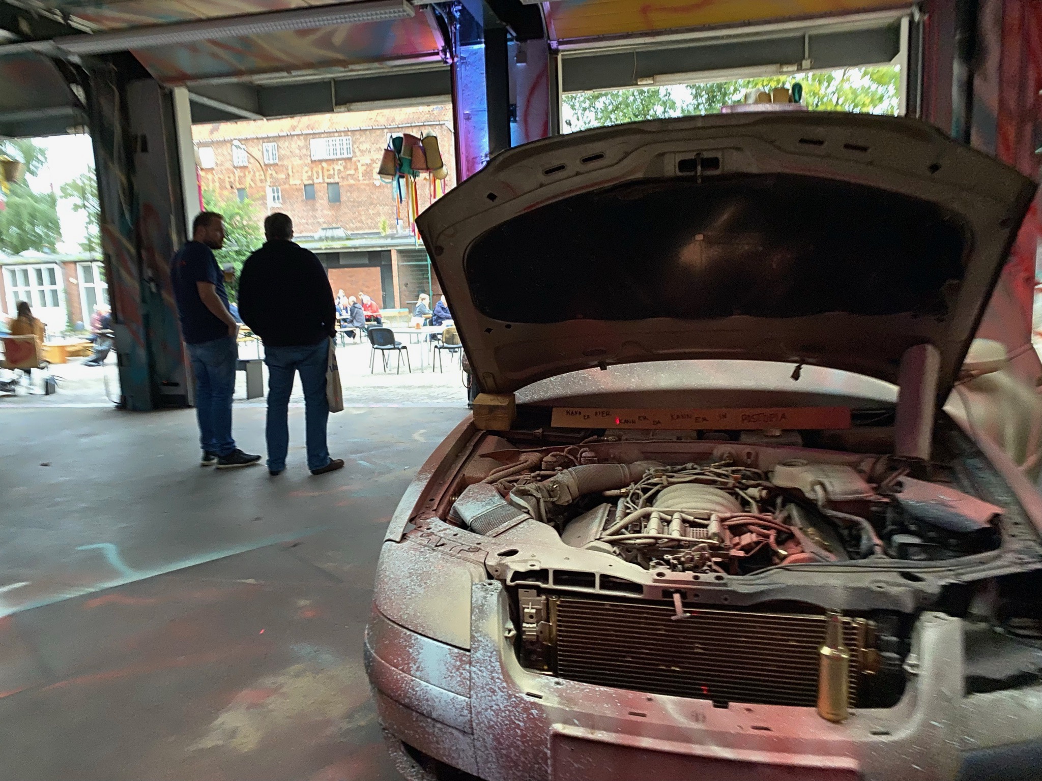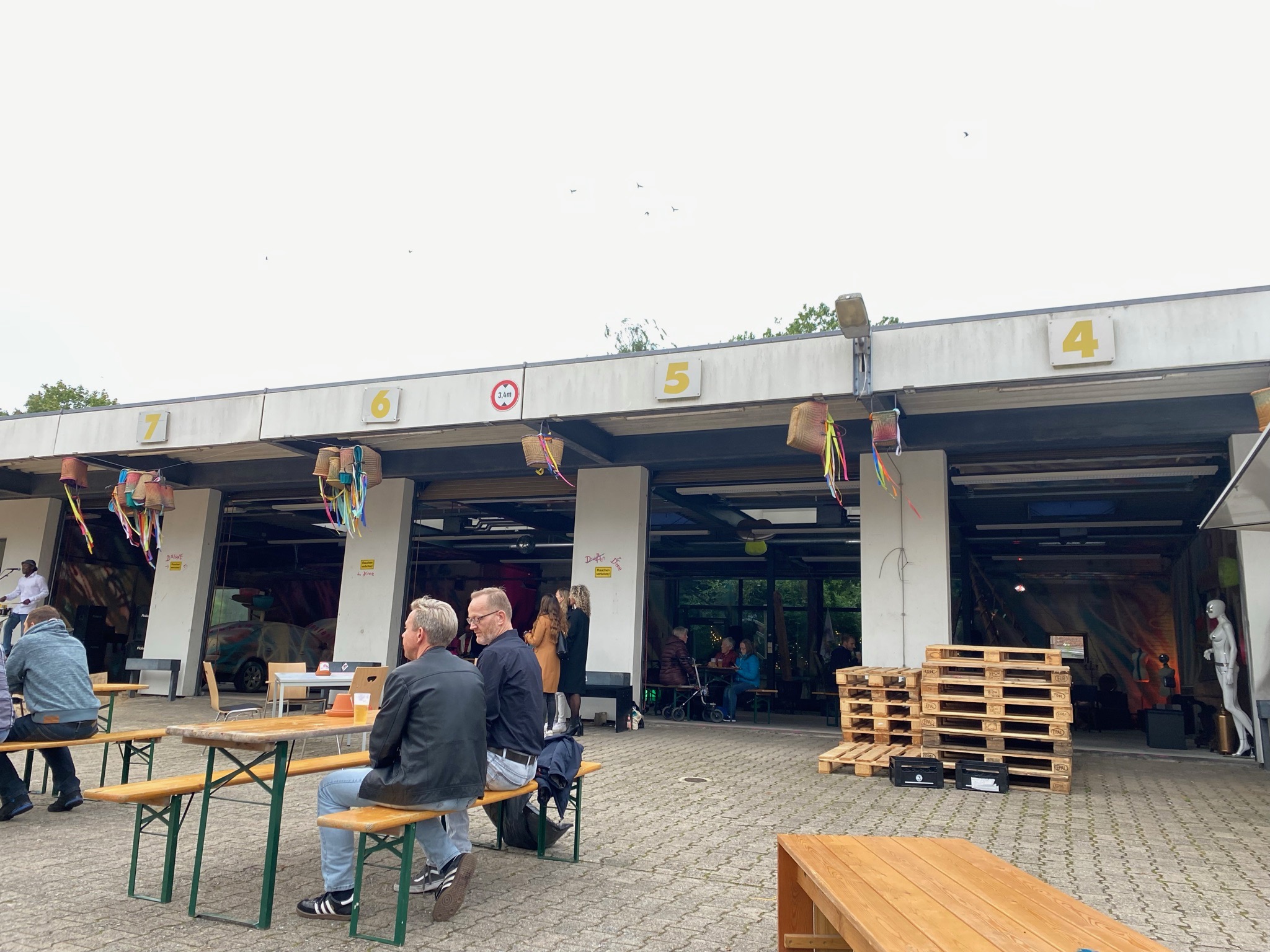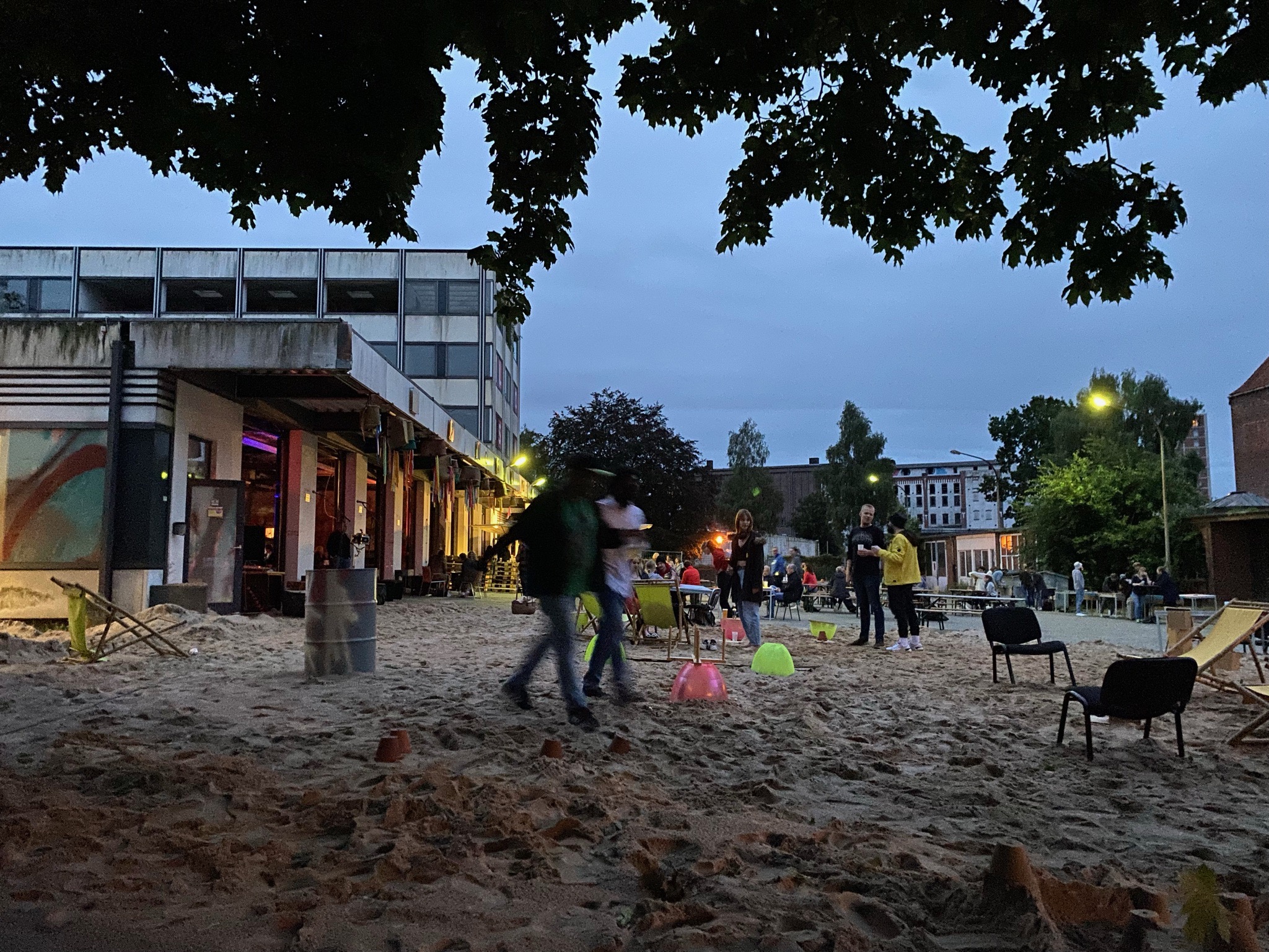 Bis zu 500 Leute können dort auf 3000 Quadratmeter Fläche im Außenbereich und 500 Quadratmeter in der alten Postgarage feiern und chillen. Für das Strandfeeling wurden 250 Tonnen Sand aufgeschüttet, für die Club-Atmosphäre sorgen Grafitti-Design und Elemente wie ein bespraytes Schrottauto, eine Schaukel und muckelige Beleuchtung. Coronakonform ist das Ganze auch, denn die Gäste können sich an Bierzeltgarnituren und auf Liegestellen großflächig im Außenbereich verteilen, der Innenraum ist dank offener Fronten auch stets gut belüftet, und dank der Tore an beiden Seiten des Areals kann man den Zugang zum Gelände auch gut kontrollieren (und bei Bedarf beschränken). Initiatoren der ganzen Aktion sind das Elmshorner Stadtmarketing zusammen mit Malte Findeisen vom Broderick und Ragazzi, bei dem alle organisatorischen Fäden zusammenlaufen und sich um Getränke (Bier vom Fass, daneben diverse alkoholfreie und alkoholische Getränke – leider kein alkoholfreies Bier bzw. Hefeweizen, das wäre noch mein Wunsch ans Team!) und kulinarische Angebote (Pommes, vegane/fleischige Bratwurst, Chicken Wings und diverse andere Kleinigkeiten) kümmert.
