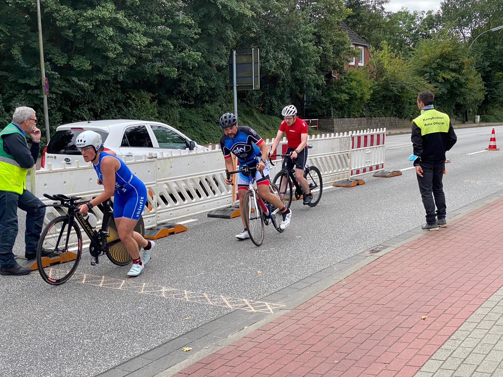 Auch 2021 war der traditionelle Elmshorner Duathlon wegen der Corona-Pandemie nur einer von sehr wenigen Wettkämpfen, in denen Triathletinnen und Triathleten sich untereinander messen können. Doch als bekannt wurde, dass auch der Hamburger Triathlon am 19. September stattfinden würde, war schon klar, dass viele Leute wohl lieber bei dem großen Event starten würden – zumal etliche noch aus 2020 Startplätze hatten, die sie nun 2021 nutzen konnten. Während im Vorjahr binnen kürzester Zeit alle 120 Startplätze vergriffen waren, verzeichnete der Duathlon dieses Mal leider nur 68 Anmeldungen. Dass von denen nur 50 tatsächlich am Start erschienen, war ein bisschen enttäuschend für das Orga-Team, das wieder ungezählte Stunden in Vorbereitung, Hygienekonzept, Organisation und Durchführung gesteckt hatte. Am Ende war es halt eine kleine, dafür aber sehr feine Veranstaltung ohne Pannen oder Stürze, mit toller Stimmung und beeindruckenden sportlichen Leistungen.