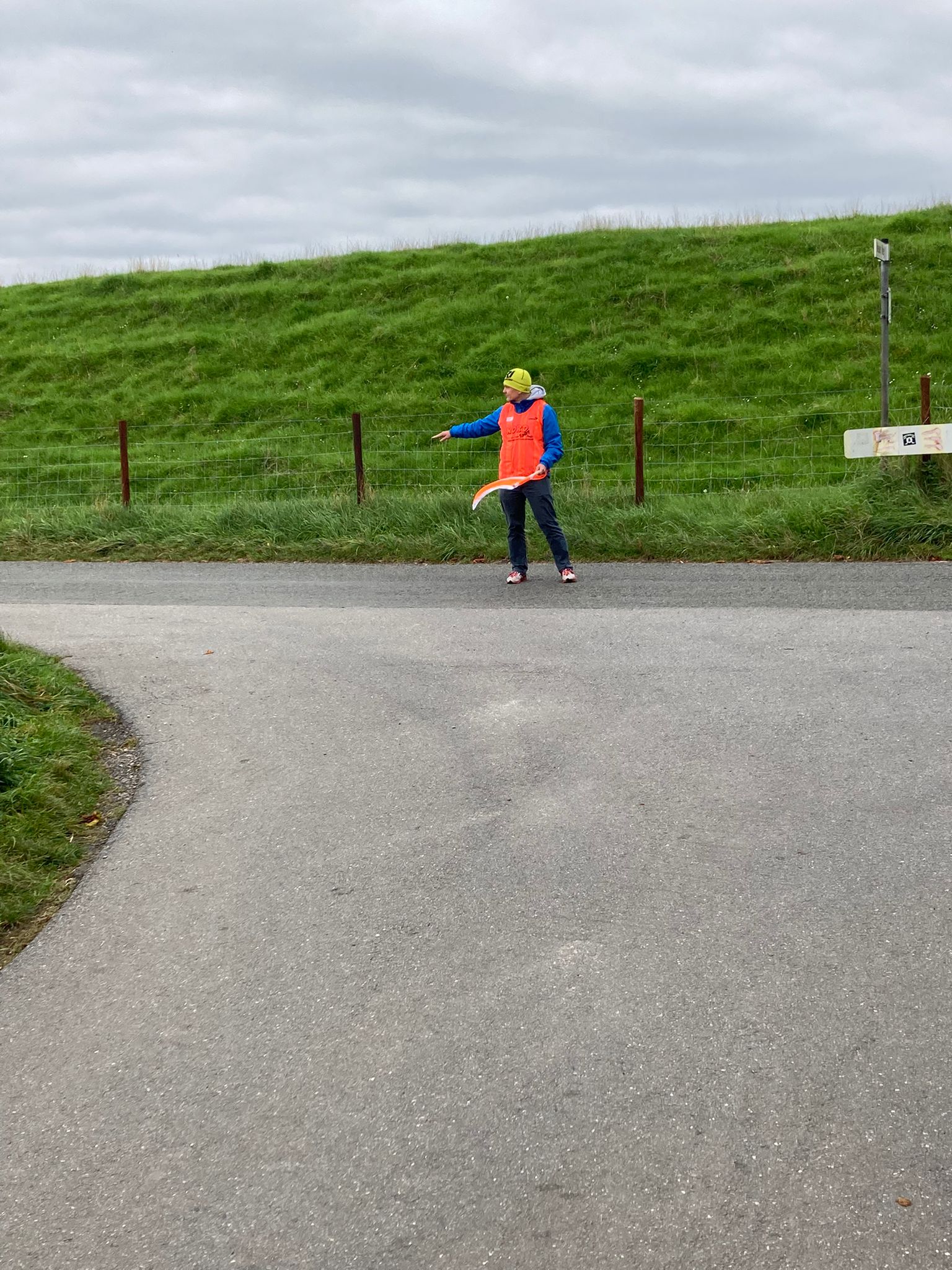 Kurz vor dem Start fuhr ich zum besagten Streckenposten 8, wo ich zusammen mit zwei anderen Helfern darauf zu achten hatte, dass die Athletinnen und Athleten richtig abbiegen und dass keine gefährlichen Situationen im Straßenverkehr entstehen. Denn die Radstrecke war für den Autoverkehr nicht gesperrt, wir mussten also immer wieder mal mit unseren leuchtend orangen Fahnen wedeln, Autos anhalten und erklären, dass da gerade eine Radsportveranstaltung stattfindet und jeden Moment Rennräder mit ordentlich Schwung um die Kurve kommen könnten. Zum Glück gab es dabei keine nervigen Diskussionen oder uneinsichtige Zeitgenossen, die partout nicht bereit sind, mal einen Moment anzuhalten und zu warten, bis der nächste Pulk um die Kurve gekommen ist und die Straße wieder frei ist. In den vergangenen Jahren war es da – wie mir die anderen Helfer berichteten – immer mal wieder zu etwas unschönen Szenen gekommen, doch dieses Mal hatten wir Unterstützung von zwei Polizisten, die sich mit einem Streifenwagen und Warnlicht auf die Fahrbahn stellte und mit ihren Polizeikellen unserer Verkehrsregelung deutlich mehr Autorität verliehen. Lustigerweise schien die Anwesenheit der Polizei an unserem Streckenposten auch bei den Athletinnen und Athleten Eindruck zu machen: Ich habe noch nie zuvor bei einer Radveranstaltung so viele Teilnehmende gesehen, die ganz brav mit Schulterblick und Handzeichen abbogen. 🙂