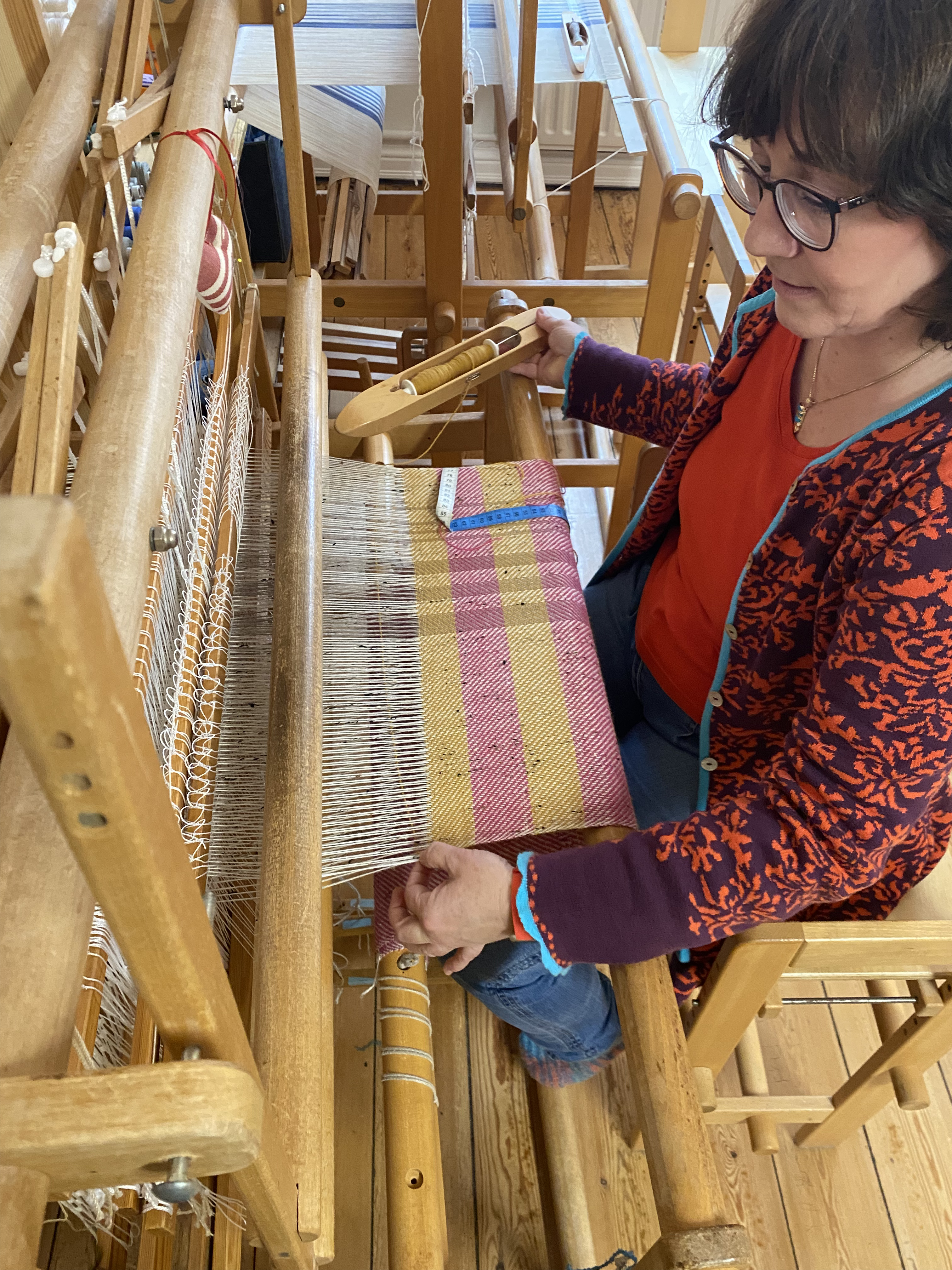 Weben erfordert also (zumindest für einen Neuling) zum einen Gefühl für das Material und das Werkzeug und zum anderen Konzentration, damit man nicht aus dem Takt gerät und versehentlich den falschen Fußtritt betätigt (oder sich nicht merkt, welcher Fußtritt zuletzt dran war, wenn das Telefon klingelt…), wodurch sich ein Fehler in das Fischgratmuster einschleicht (wie man auf dem Foto mit dem gelben Farbblock unschwer erkennen kann). Doch wenn sich die Füße an die Reihenfolge der Tritte gewöhnt und die Hände ein Gefühl für den richtigen Schwung bekommen haben, mit dem sie das Schiffchen in Gang setzen müssen, dann wird Weben geradezu meditativ: Wie auch bei anderen Handarbeiten oder beim Malen gelang es mir, komplett abzutauchen aus meinen sonstigen Gedanken, und ich war nur in der Werkstatt, nur bei meinem pink- und senffarbenen Garn, nur bei der Links-Rechts-Bewegung des Schiffchens, das Reihe für Reihe und Zentimeter für Zentimeter Stoff aus den Fäden Stoff zauberte. Immer wenn wieder einige Zentimeter dazugekommen waren, musste ich die Fäden des Webstuhls nachspannen: Hinten auf der Rolle wurden die gebundenen Kettfäden abgewickelt und vorn auf der Rolle der fertige Stoff aufgewickelt.