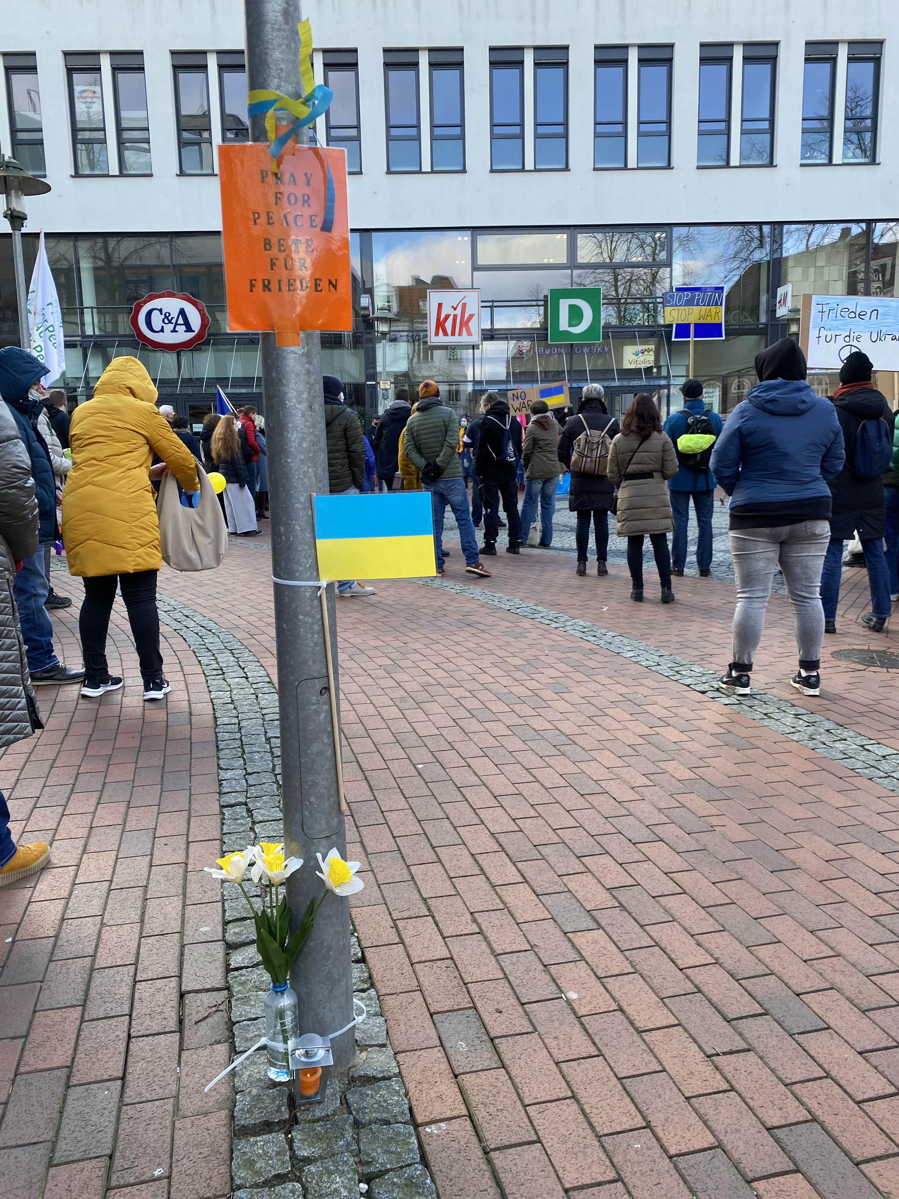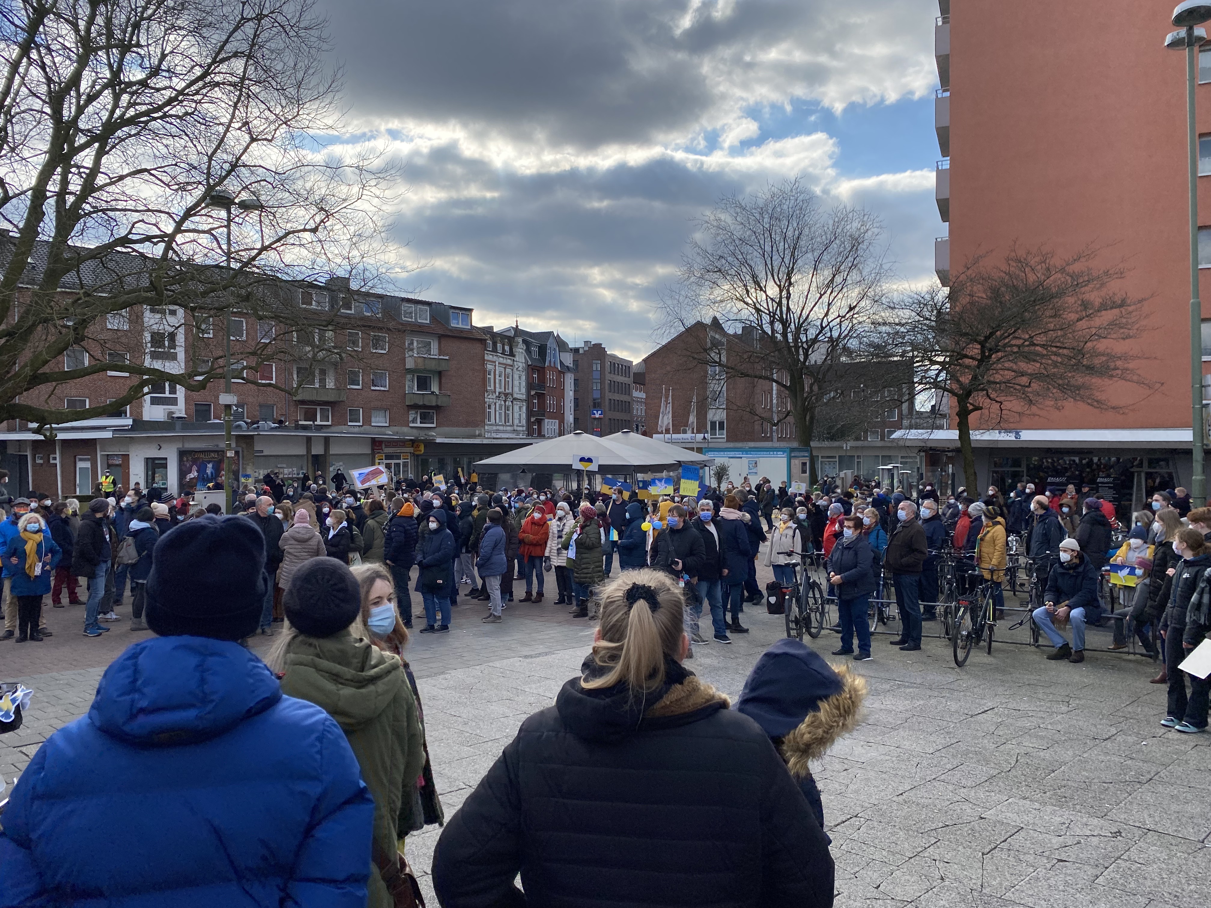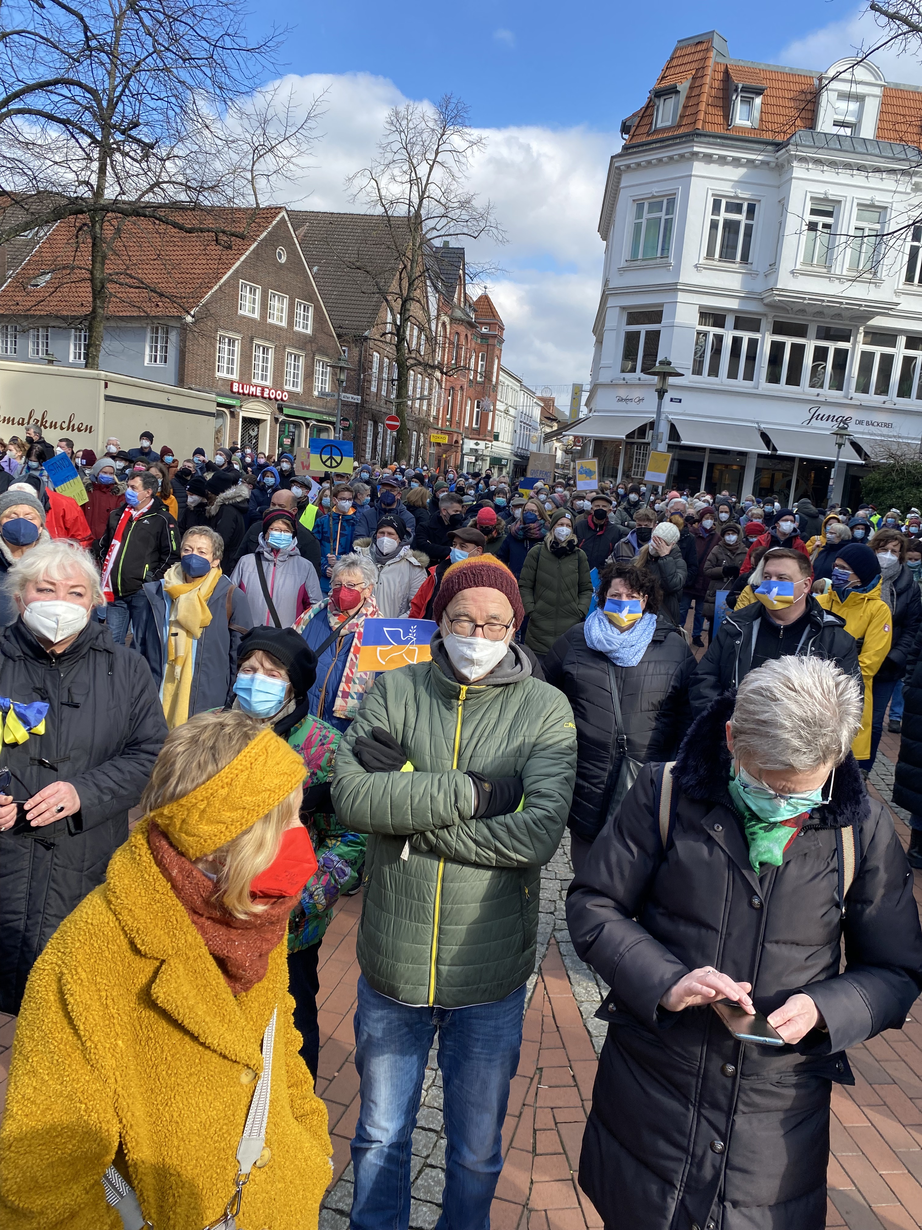 Ich bin froh, dass ich heute bei der Demo mit dabei war. Es ist wichtig, dass wir den Menschen in der Ukraine zeigen, dass wir an sie denken und uns mit ihnen solidarisieren. Dass wir auch unserer Regierung zeigen, was wir von ihrem außenpolitischen Kurs halten – ich persönlich bin mit diesem zurzeit ganz überwiegend einverstanden. Doch auch uns als Zivilgesellschaft tut es gut, uns in einer größeren Gruppe zu treffen, uns unseres Zusammenhalts zu vergewissern, in andere besorgte Gesichter zu blicken, gemeinsam zu demonstrieren und aus den Augenwinkeln zu registrieren, dass auch andere bei so manchen Redebeiträgen mit den Tränen kämpfen. Dass heute so viele Menschen allen Alters in Elmshorn dabei waren, macht mir Mut – vor allem weil es in den vergangenen Monaten eher die selbsternannten Querdenker waren, die mit ihren ‚Spaziergängen‘ Gruppenstärke demonstrieren wollten. Es freut mich, dass der Alte Markt heute von so viel mehr Menschen bevölkert wurde, die nicht etwa gegen eine vermeintliche ‚Impf-Diktatur‘ protestieren, sondern sich mit den Opfern einer lupenreinen echten Diktatur solidarisieren wollten. Das ist mein Elmshorn! Ich hoffe, dass bei der nächsten Veranstaltung dieser Art mindestens ebenso viele Menschen zusammenkommen.