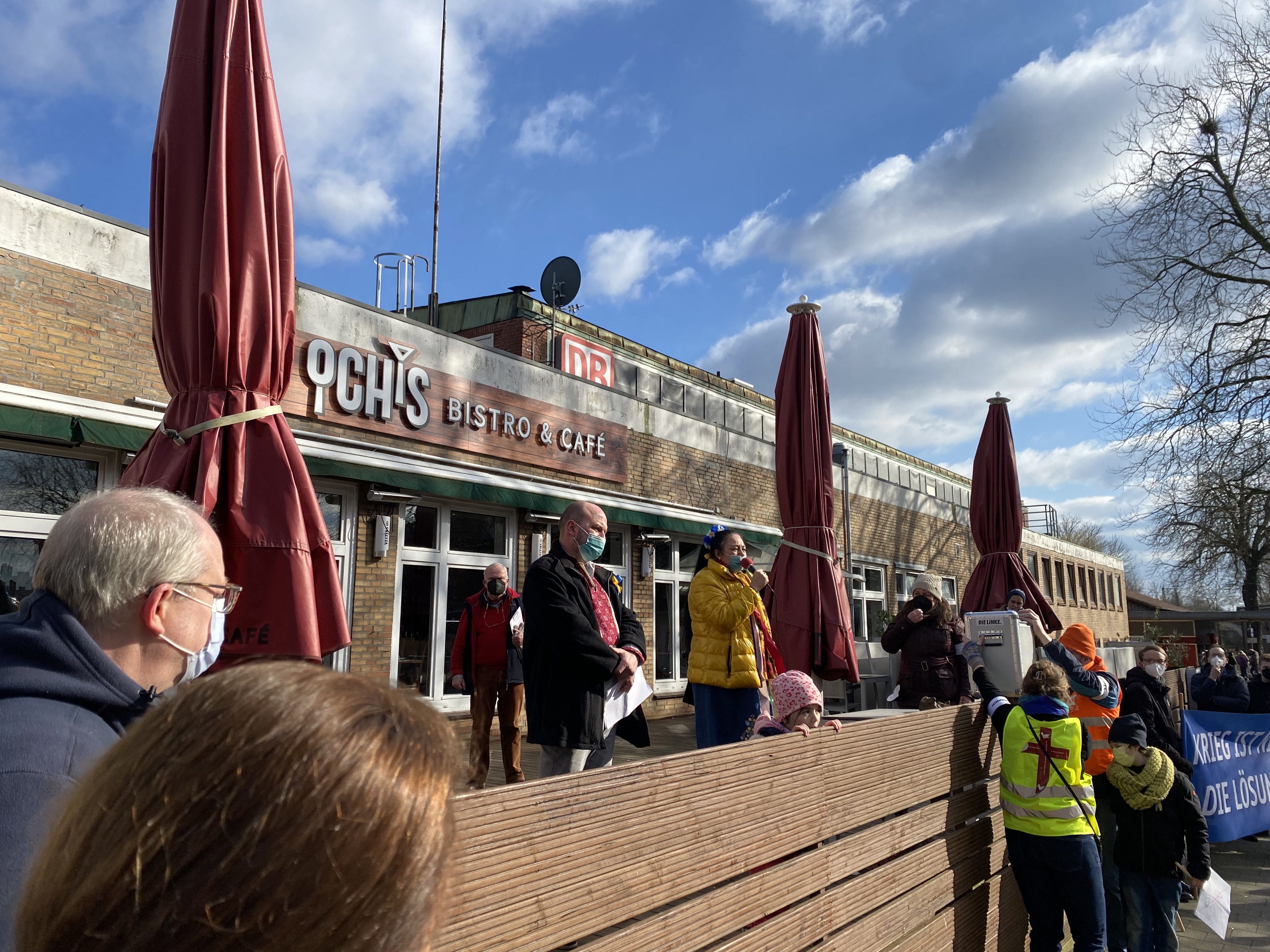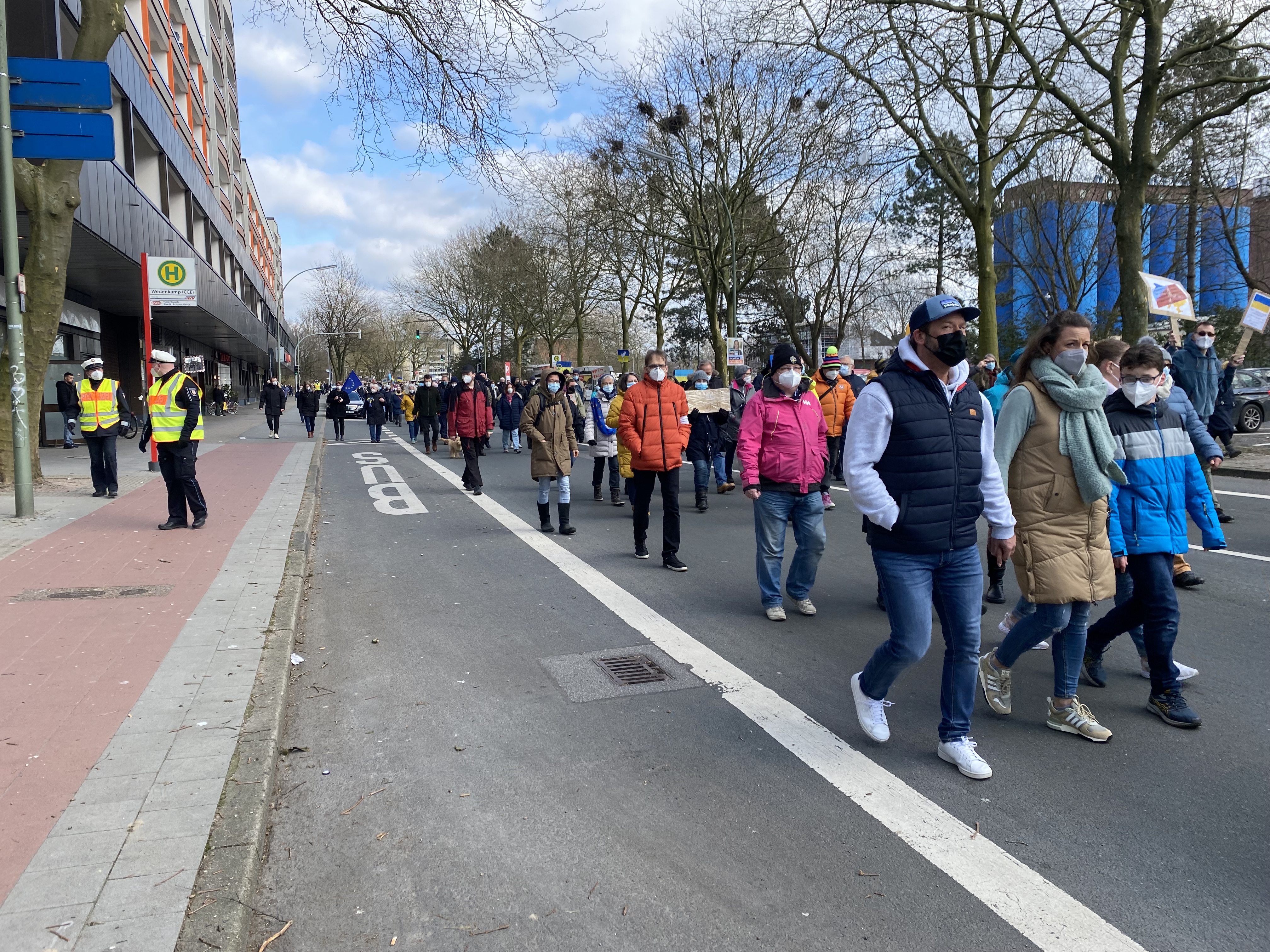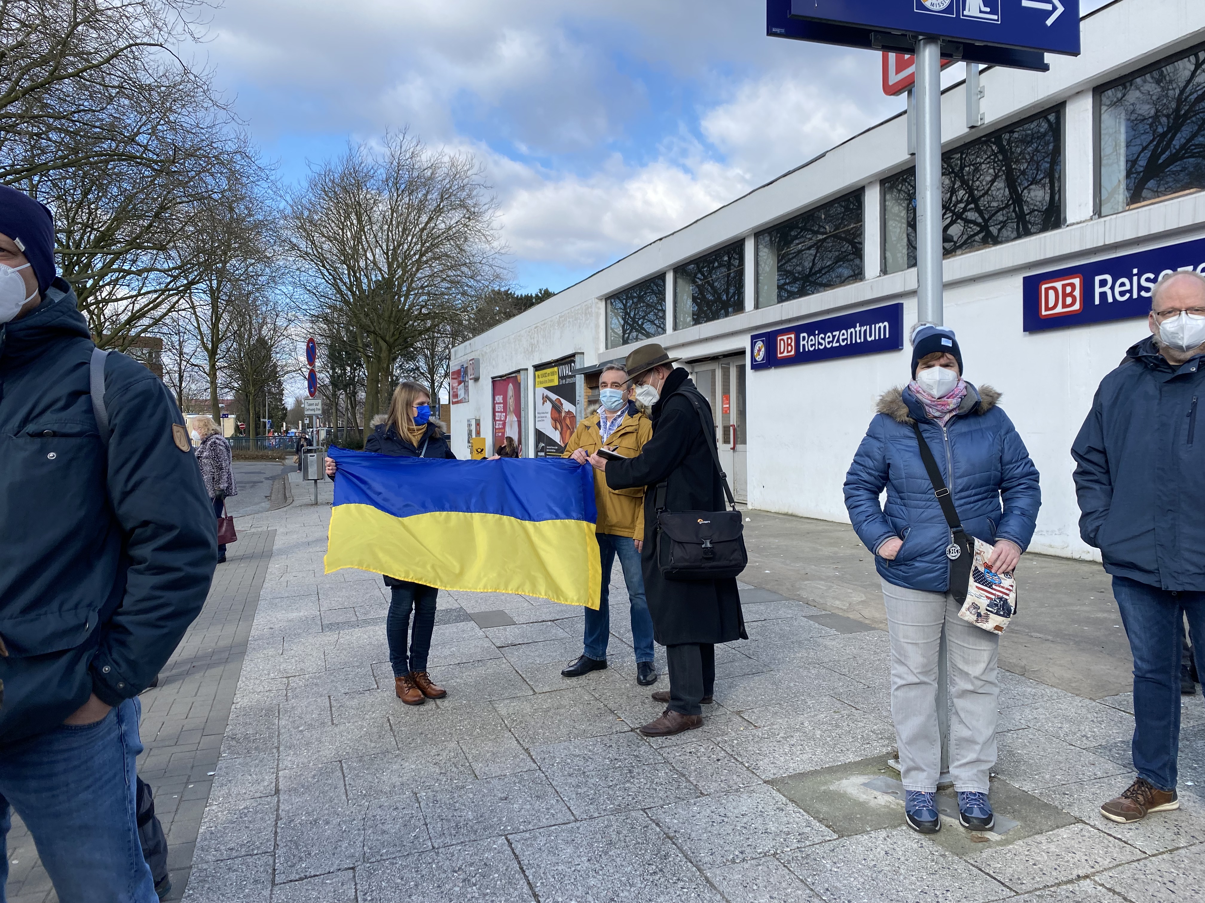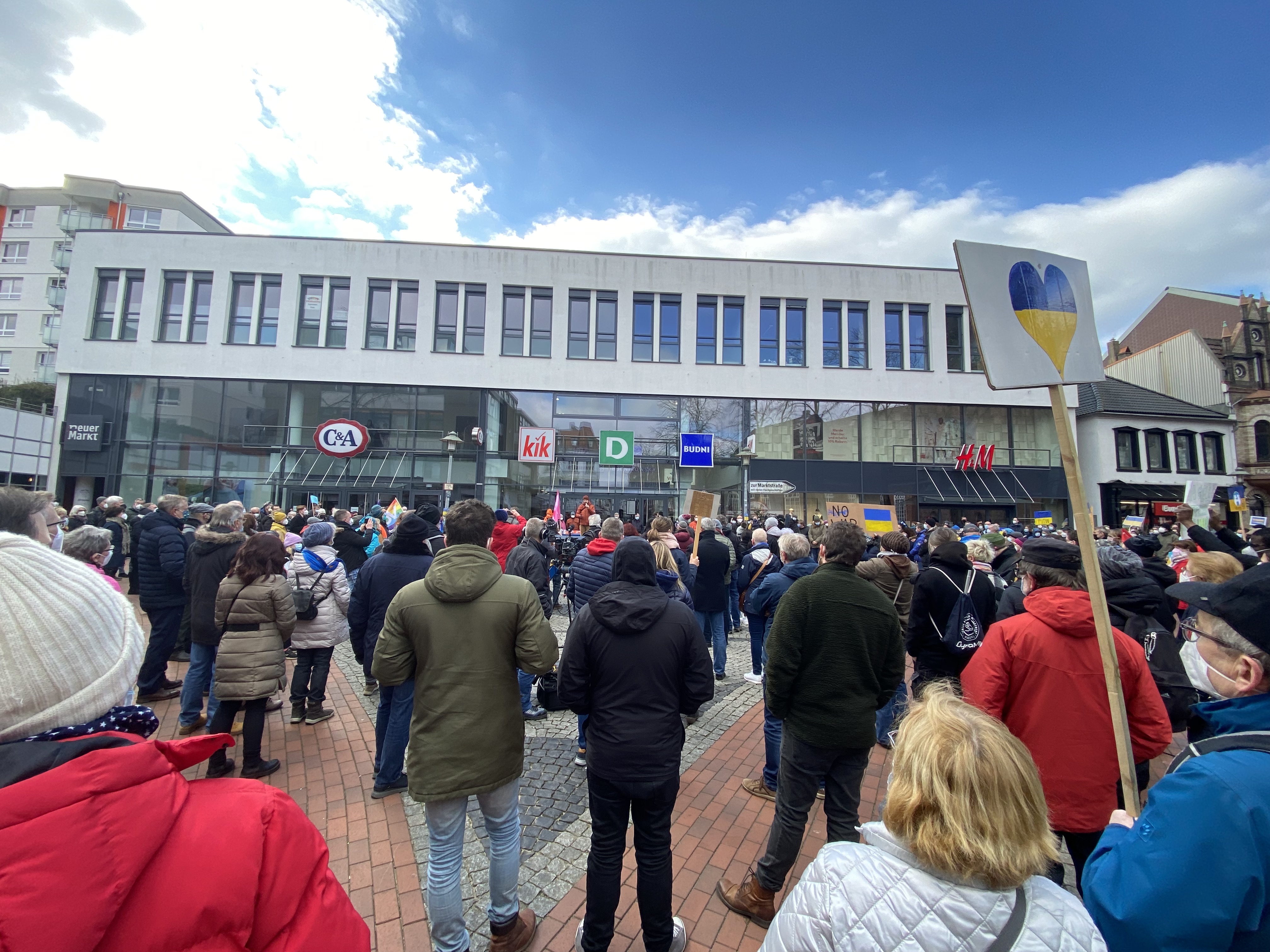 Ich bin froh, dass ich heute bei der Demo mit dabei war. Es ist wichtig, dass wir den Menschen in der Ukraine zeigen, dass wir an sie denken und uns mit ihnen solidarisieren. Dass wir auch unserer Regierung zeigen, was wir von ihrem außenpolitischen Kurs halten – ich persönlich bin mit diesem zurzeit ganz überwiegend einverstanden. Doch auch uns als Zivilgesellschaft tut es gut, uns in einer größeren Gruppe zu treffen, uns unseres Zusammenhalts zu vergewissern, in andere besorgte Gesichter zu blicken, gemeinsam zu demonstrieren und aus den Augenwinkeln zu registrieren, dass auch andere bei so manchen Redebeiträgen mit den Tränen kämpfen. Dass heute so viele Menschen allen Alters in Elmshorn dabei waren, macht mir Mut – vor allem weil es in den vergangenen Monaten eher die selbsternannten Querdenker waren, die mit ihren ‚Spaziergängen‘ Gruppenstärke demonstrieren wollten. Es freut mich, dass der Alte Markt heute von so viel mehr Menschen bevölkert wurde, die nicht etwa gegen eine vermeintliche ‚Impf-Diktatur‘ protestieren, sondern sich mit den Opfern einer lupenreinen echten Diktatur solidarisieren wollten. Das ist mein Elmshorn! Ich hoffe, dass bei der nächsten Veranstaltung dieser Art mindestens ebenso viele Menschen zusammenkommen.