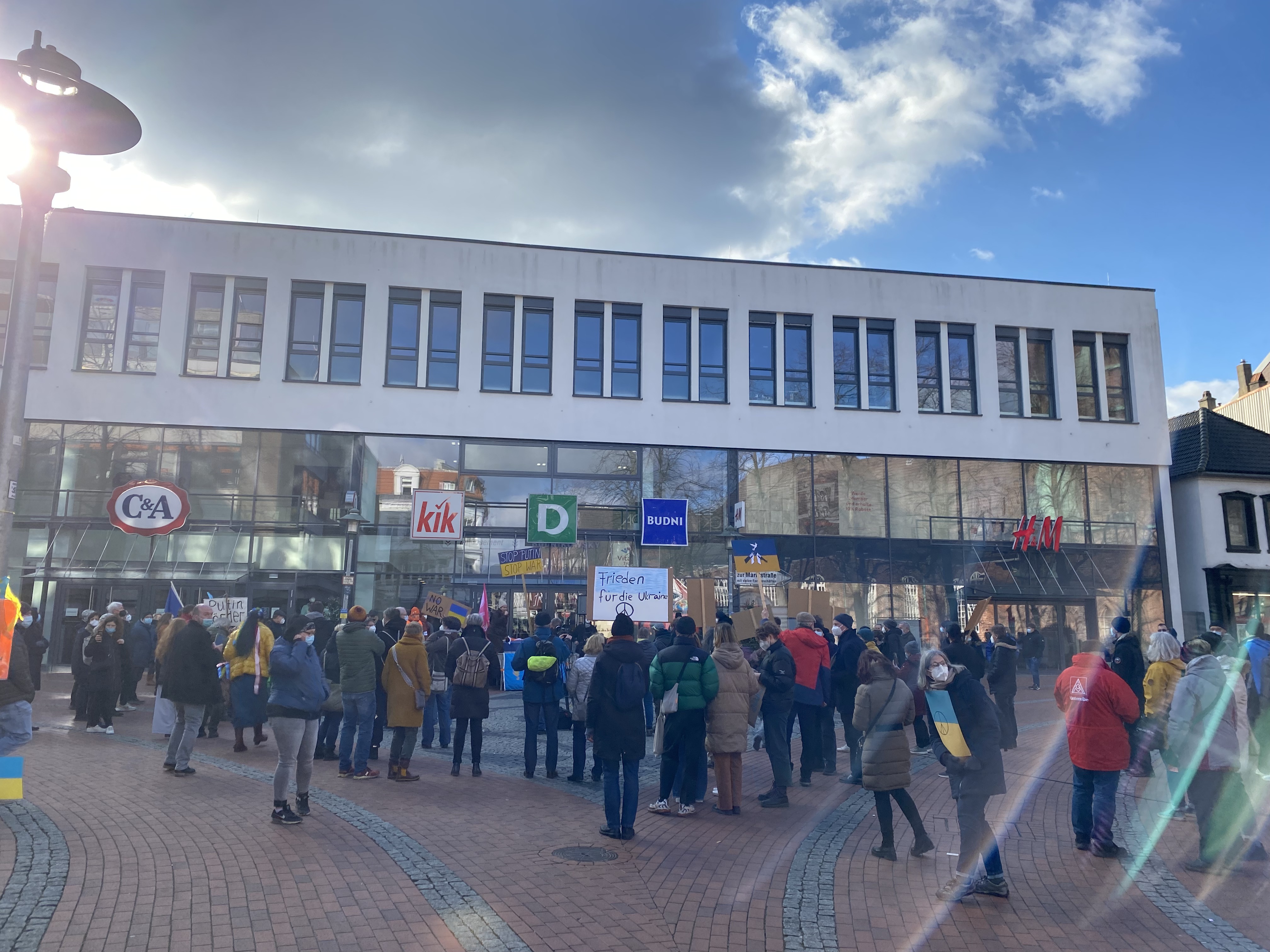 Heute Nachmittag haben insgesamt rund 1.500 Menschen in der Elmshorner City gegen Putins Krieg gegen die Ukraine demonstriert. So viele gelbe und blaue Jacken, Mützen oder Schals sieht man sonst nicht im Stadtbild. Noch mehr beeindruckt hat mich allerdings die friedliche Stimmung und die Einigkeit der Teilnehmenden.