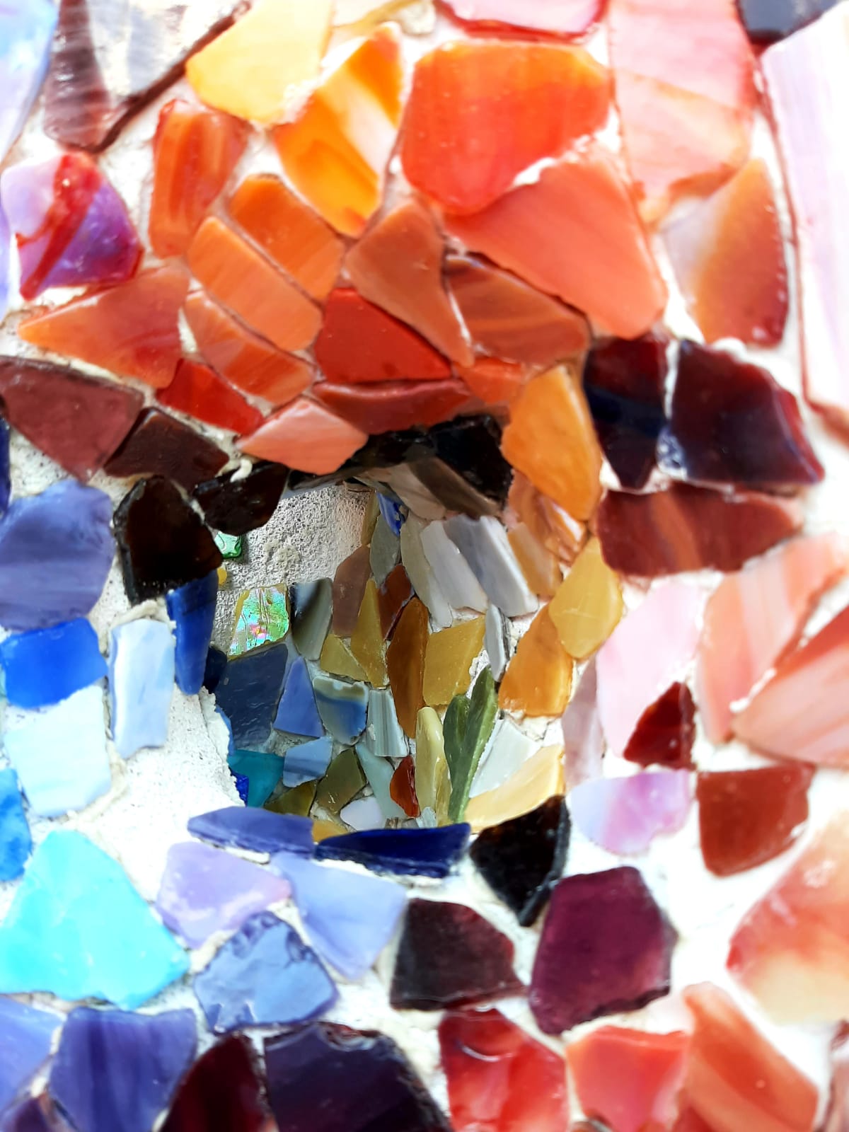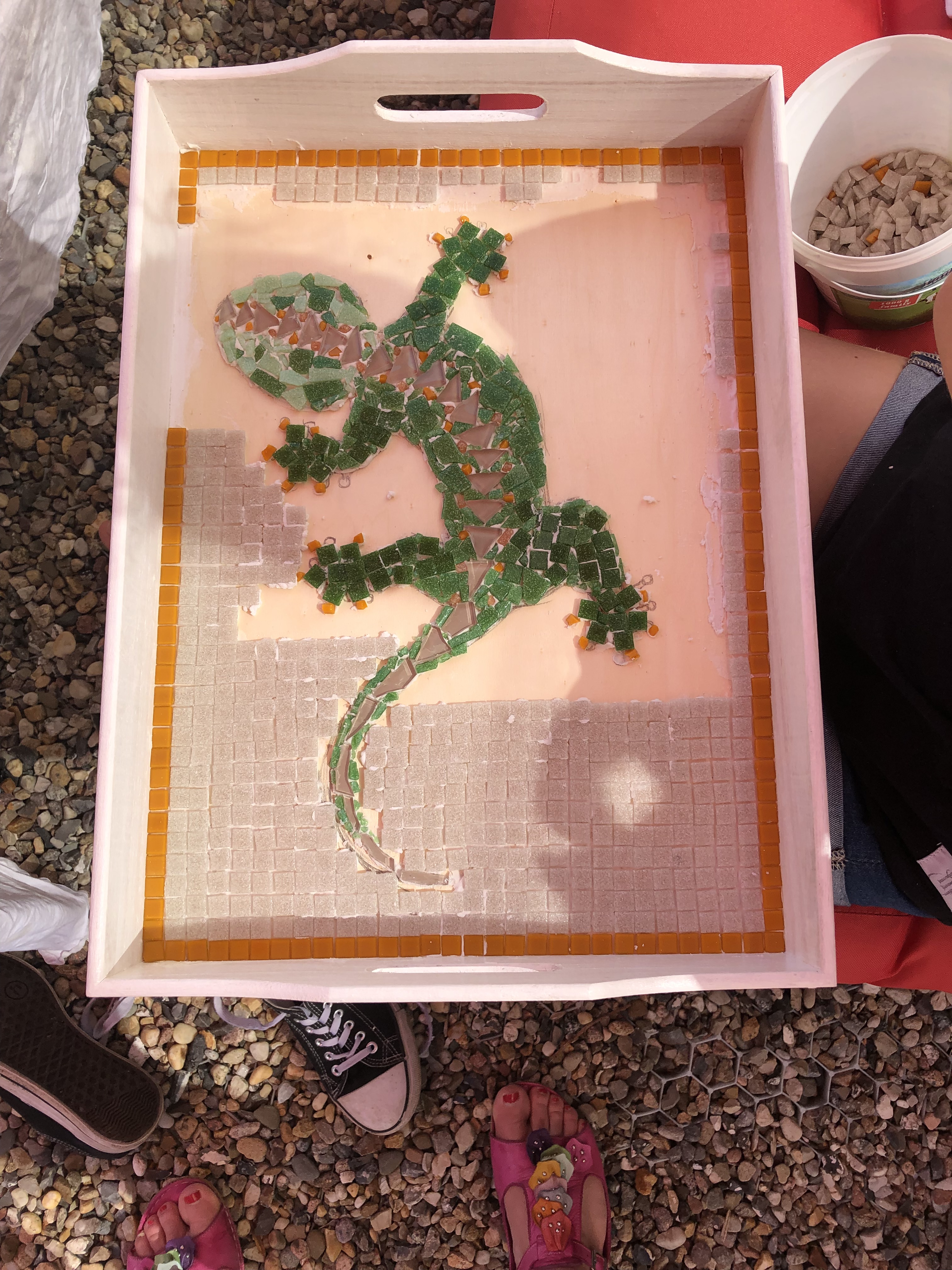 Bei meiner Idee, daraus ein Mosaikobjekt zu machen, hatte ich allerdings nicht bedacht, dass es ganz schön frickelig sein würde, mit den Händen bzw. Fingern in die diversen Höhlengänge hineinzugreifen und Mosaikscherben aufzukleben. Zudem ist die Oberfläche von Ytong uneben und rau, sodass Fliesenkleber nicht immer perfekt darauf haftet. Mehr als einmal fielen mir aufgeklebte Mosaikscherben wieder entgegen, die ich gerade erst mühselig in ihrem designierten Platz befestigt hatte. Ein paar Fortschritte machte ich, als im Sommer 2019 meine Nichte zu Besuch war und ein Holztablett mit einem Mosaik-Gecko verzierte. Als Corona uns alle mehr Zeit zu Hause bescherte, war ich überzeugt, dass ich nun endlich mein Mosaik-Projekt vollenden würde und kündigte das sogar hier auf dem Blog schon hoffnungsvoll an. Doch letztlich verbrachte ich die ersten Corona-Monate dann doch eher damit, aus Stoffresten Masken zu nähen… (ist das nicht irre, wie lang her das inzwischen schon wieder ist?).