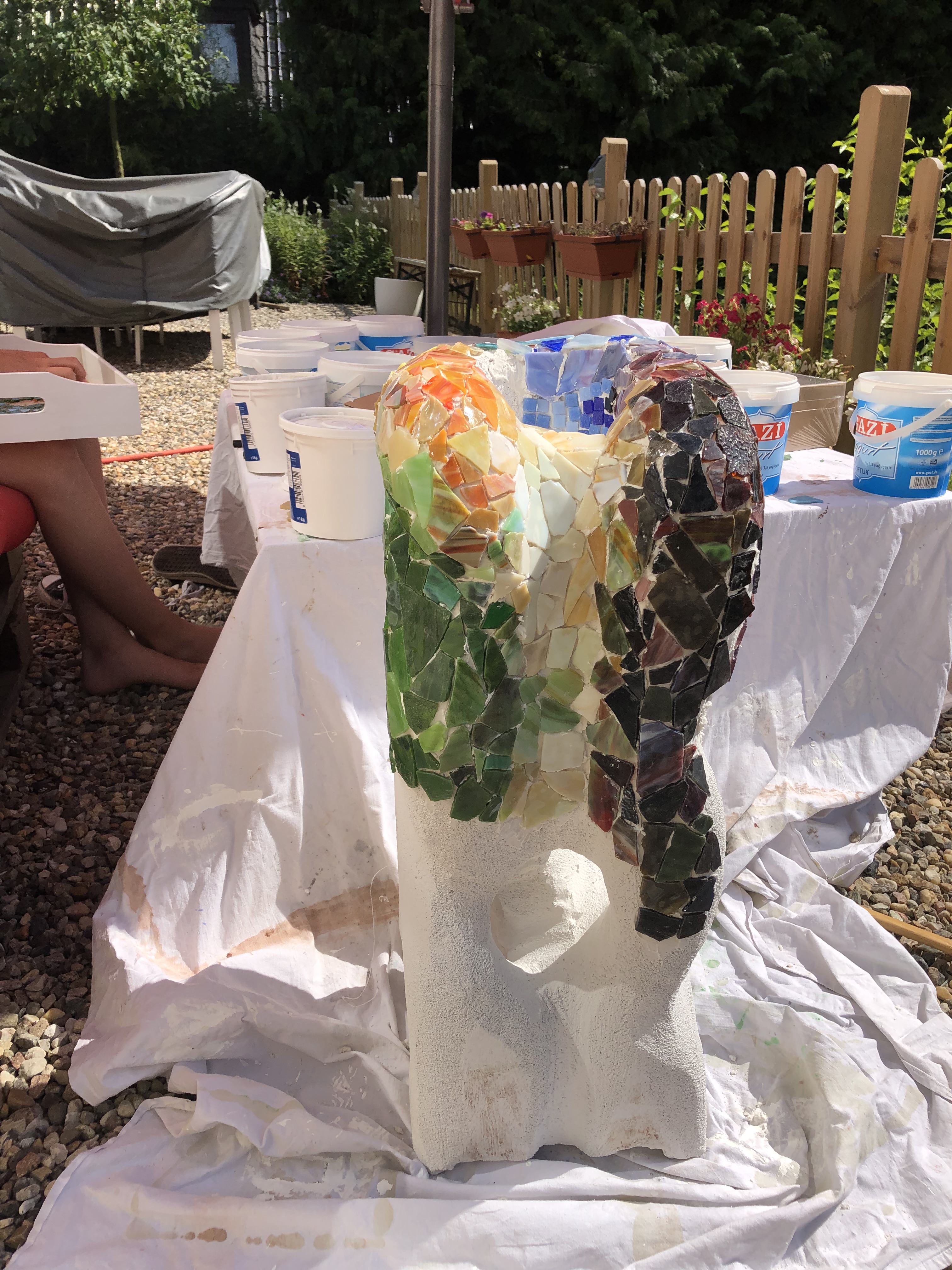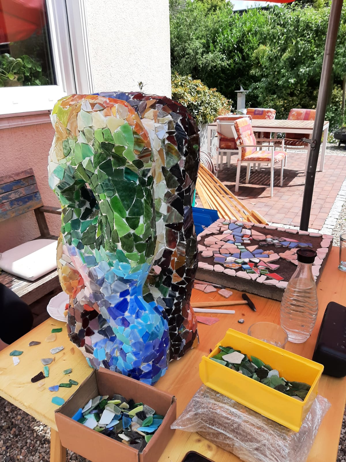 Manche Projekte brauchen einfach eine Weile bis zur Vollendung. Die Mosaik-Skulptur, mit der ich im April 2018 im Rahmen eines Bildhauerkurses an der Dittchenbühne begonnen habe, ist ein solches Projekt. Lang hat es gedauert, bis ich das aus Ytong herausgeschälte Objekt über und über mit Mosaikplättchen beklebt und verfugt habe. Doch nun ist es vollbracht, das schöne Stück steht in unserem Garten.