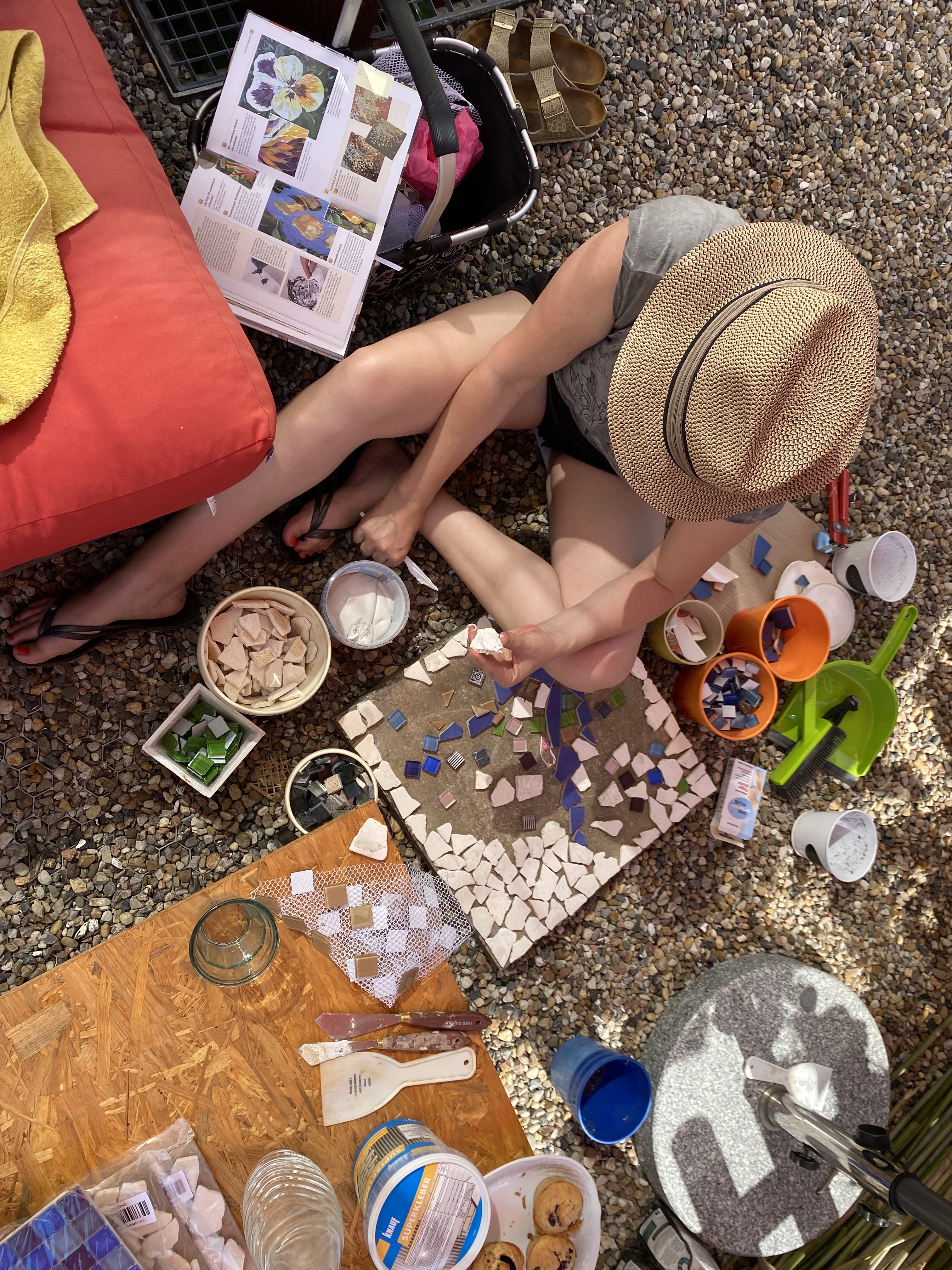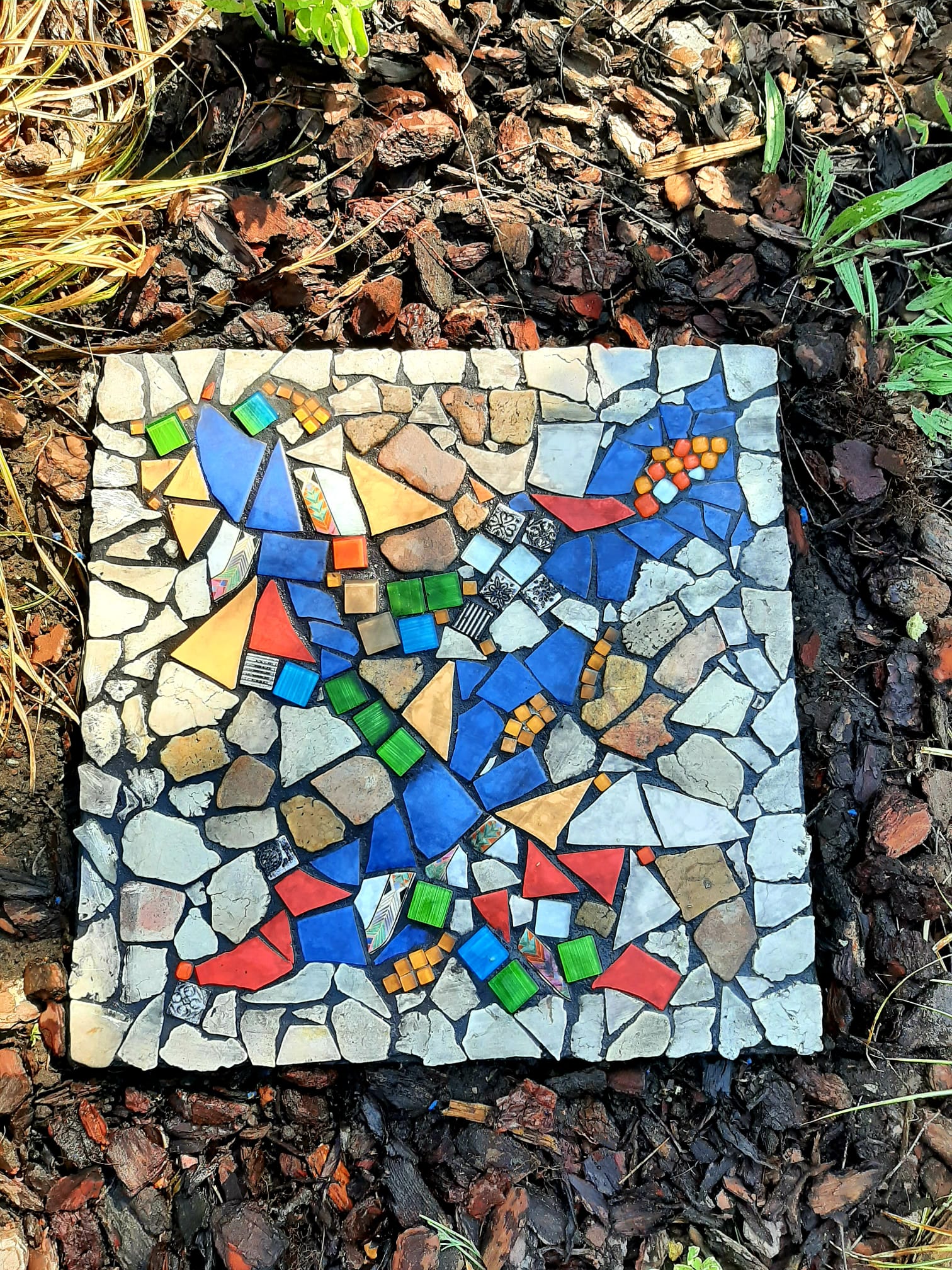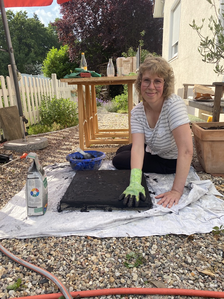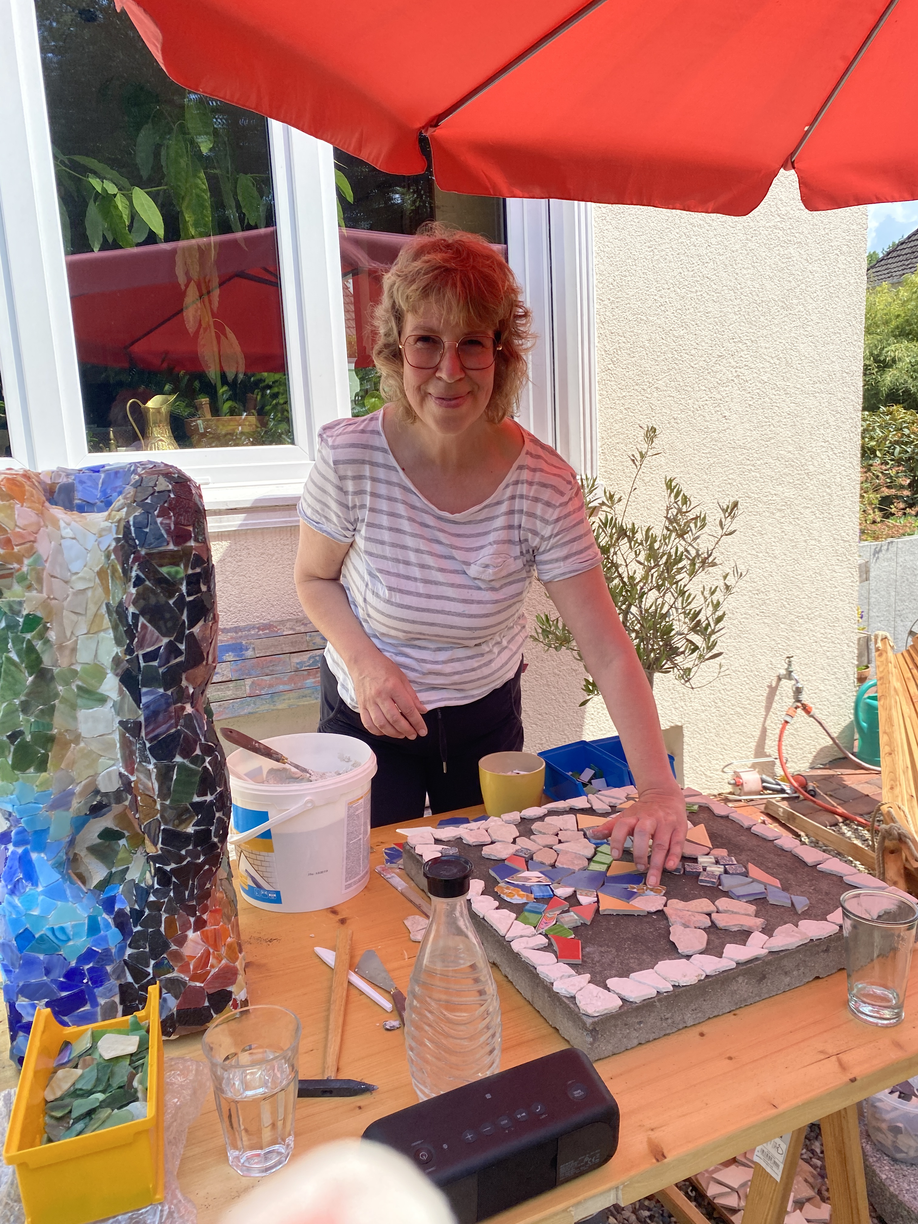 Im Sommer 2021 bat mich auch meine Freundin Petra, mich ein bisschen in die Welt der Mosaikkunst einzuführen. Sie wollte ein paar alte Gehwegplatten aufhübschen und als Dekoelemente in den Garten legen. Ich nutzte also wieder die Gunst der Stunde, auch an meinem Mosaikprojekt zu arbeiten.
