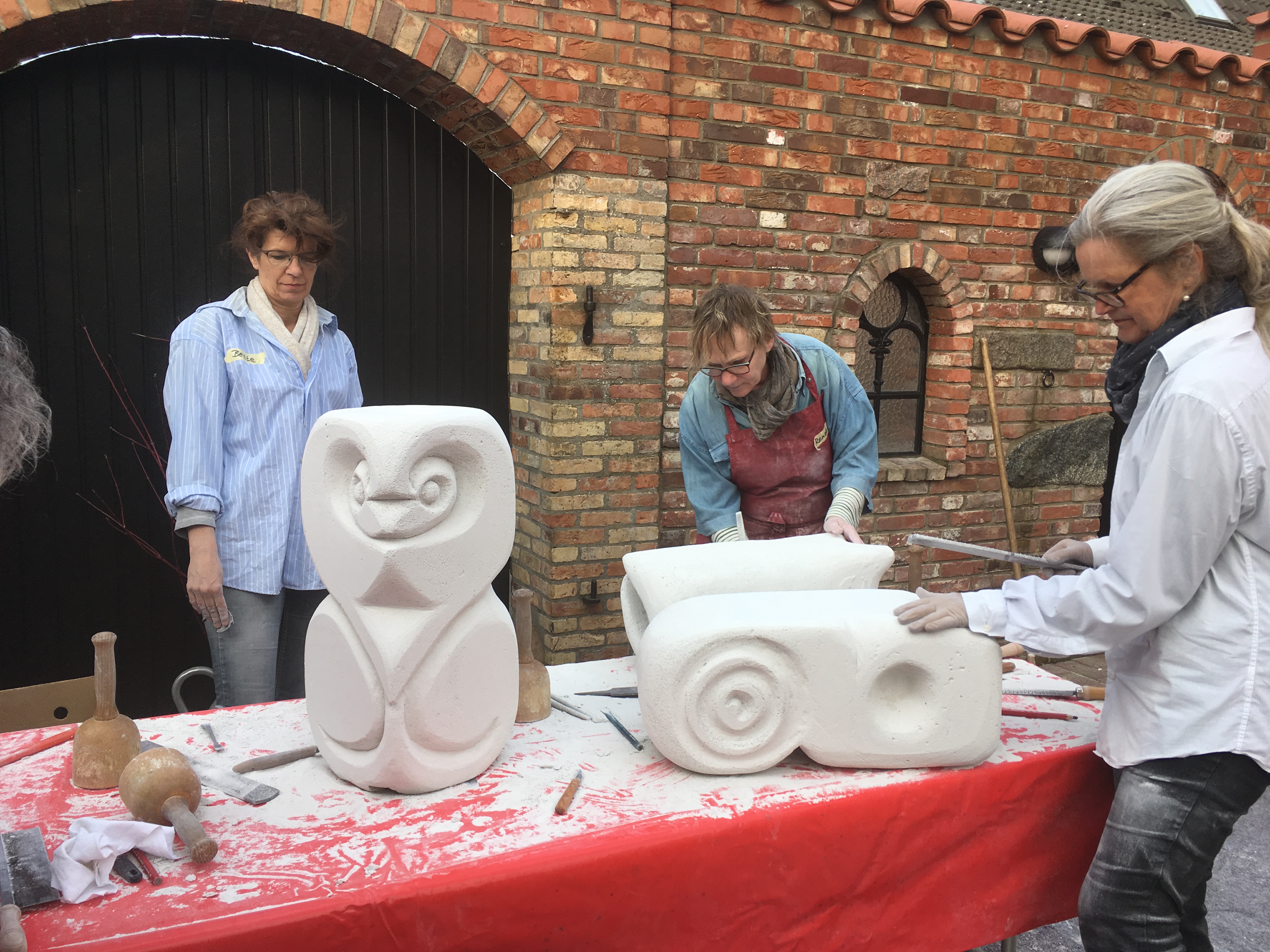 Diesen Gedanken hatte ich bereits diffus im Hinterkopf, als ich mich für April 2018 zu einem Bildhauerkurs in der Dittchenbühne anmeldete. Auf alle Fälle hatte ich natürlich vor, über den Kurs und mein Endergebnis zu bloggen. Hätte ich damals gewusst, dass es bis zur Vollendung meines Werks über 6 Jahre dauern würde, hätte ich mir sicherlich im Verlauf des Kurses ein paar Notizen gemacht und mir auch den Namen des Kursleiters aufgeschrieben. Damals dachte ich, dass ich den mit Säge, Hammer, Meißel und Feile bearbeiteten Ytong-Stein in Windeseile mit Mosaikscherben bekleben, verfugen und im Garten aufstellen würde – längst bevor ich die Details des Kurses vergessen hätte.