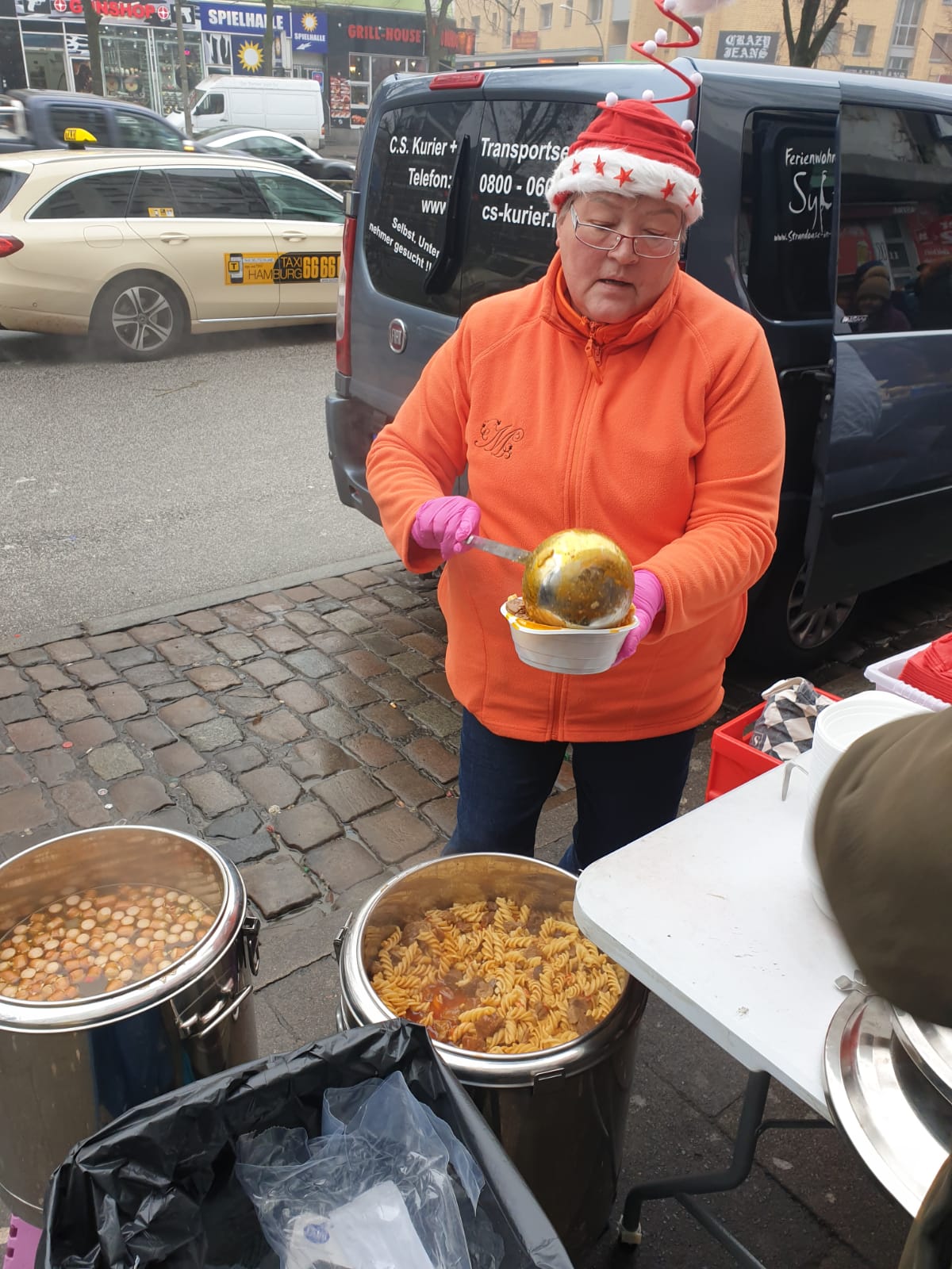 Alle zwei Wochen fahren die ‚Elmshorner Suppenhühner‘ tagsüber nach Hamburg, bauen an der Reeperbahn Tische auf und verteilen Essen an Wohnungslose. Wenn sie wieder zurück nach Elmshorn kommen, sind die Bedürftigen am hiesigen Bahnhof dran. Bei jeder dieser Aktionen wandern gut und gern 200 bis 300 Liter Erbsensuppe, Chili con Carne oder Gulaschsuppe aus riesigen Töpfen in Portionsschalen aus Pappe. Zwischen 200 und 450 Menschen in Hamburg und noch einmal bis zu 50 in Elmshorn kommen auf diese Weise zu einer warmen Mahlzeit, Hygieneartikeln, frischer Kleidung und etwas Zuwendung.