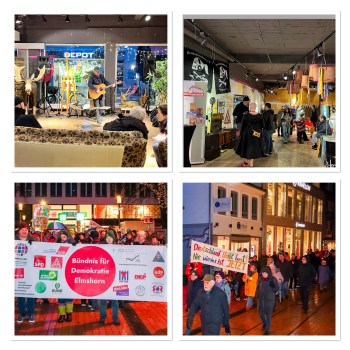 Zuerst haben wir im Pop Up Store in der Königstraße 53 vorbeigeschaut, wo das Kulturkombinat Elmshorn gemeinsam mit dem Stadtmarketing eine bunte Mischung aus Livemusik, Infoständen verschiedener Organisationen, Workshops, einer Lesung und Kunstausstellungen auf die Beine gestellt hatte. Im Anschluss ging es gleich weiter auf der Demonstration für Demokratie und gegen den Rechtsruck in Deutschland.