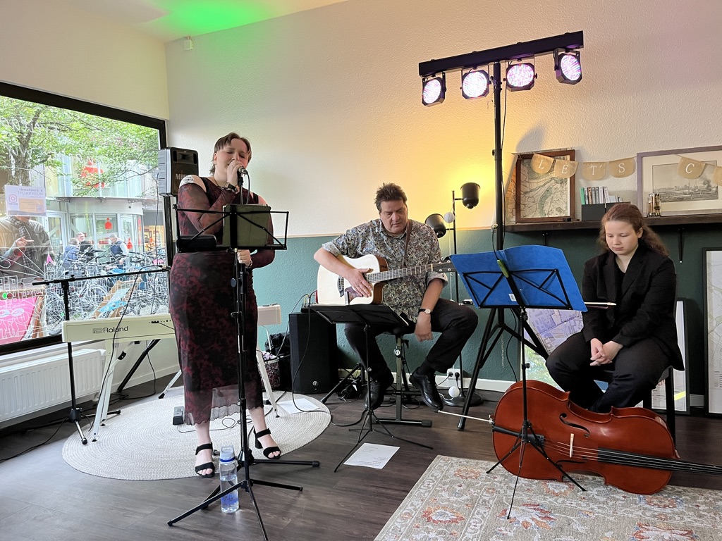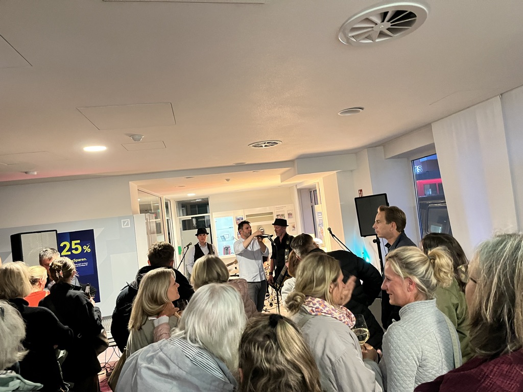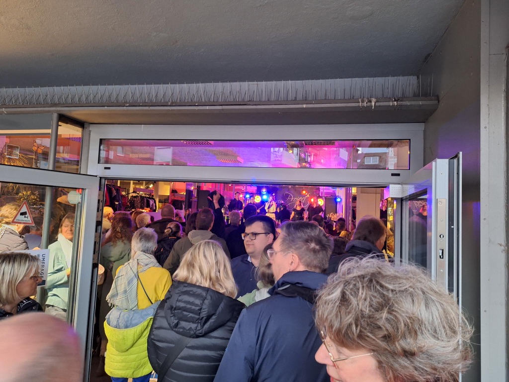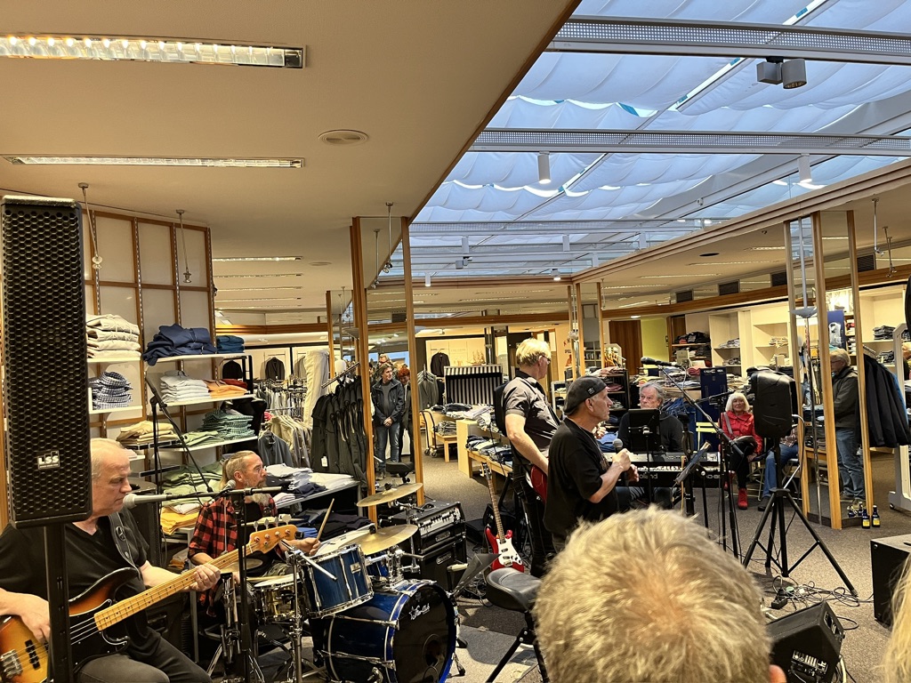 - Das Drumherum schafft ganz eigenes Ambiente. Es macht was mit der Musik, wenn sie mal nicht in einer Konzerthalle oder auf einer Festivalbühne, sondern in einem Modegeschäft, im Sanitätshaus oder beim Optiker gespielt wird. Der Blick auf die Band ändert sich, wenn sich im Hintergrund auf den Regalen die Pullover stapeln, man aus dem Augenwinkel noch die neuesten Brillenmodelle oder Zinskonditionen studieren oder am Sales-Kleiderständer nach Schnäppchen schauen kann (auch wenn man sie dann nicht direkt shoppen kann, die Läden sind bei der Musiknacht nur Kulisse und es findet kein Verkauf statt).