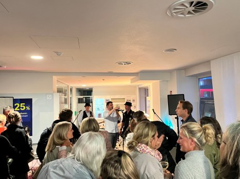 - Das Drumherum schafft ganz eigenes Ambiente. Es macht was mit der Musik, wenn sie mal nicht in einer Konzerthalle oder auf einer Festivalbühne, sondern in einem Modegeschäft, im Sanitätshaus oder beim Optiker gespielt wird. Der Blick auf die Band ändert sich, wenn sich im Hintergrund auf den Regalen die Pullover stapeln, man aus dem Augenwinkel noch die neuesten Brillenmodelle oder Zinskonditionen studieren oder am Sales-Kleiderständer nach Schnäppchen schauen kann (auch wenn man sie dann nicht direkt shoppen kann, die Läden sind bei der Musiknacht nur Kulisse und es findet kein Verkauf statt).