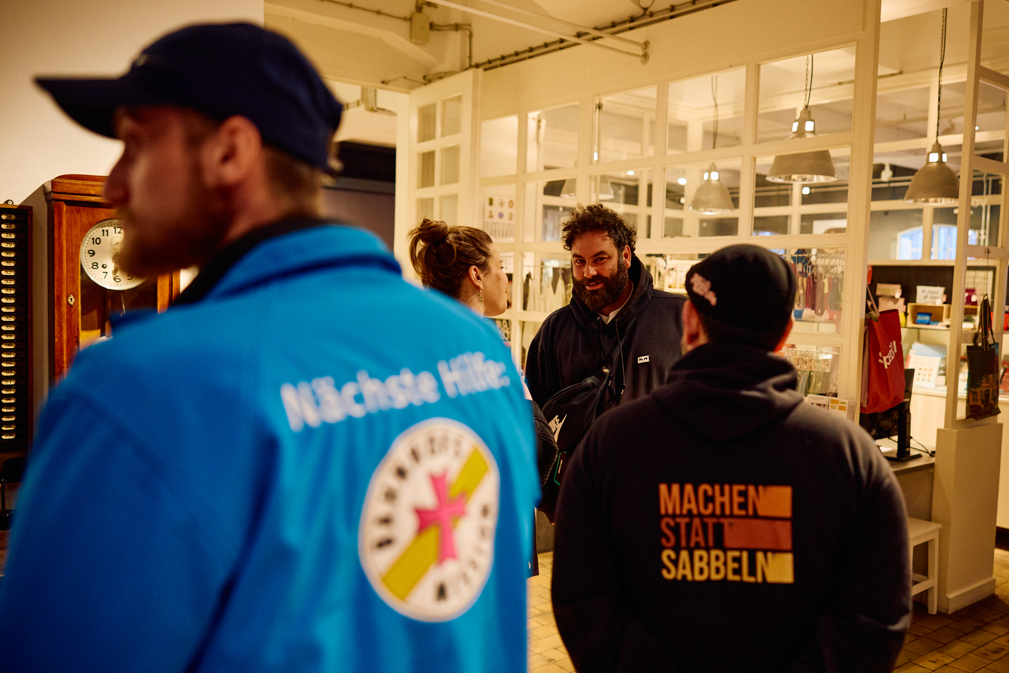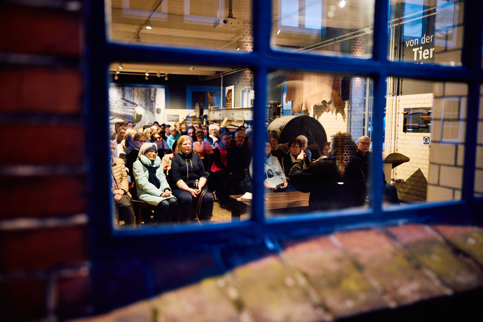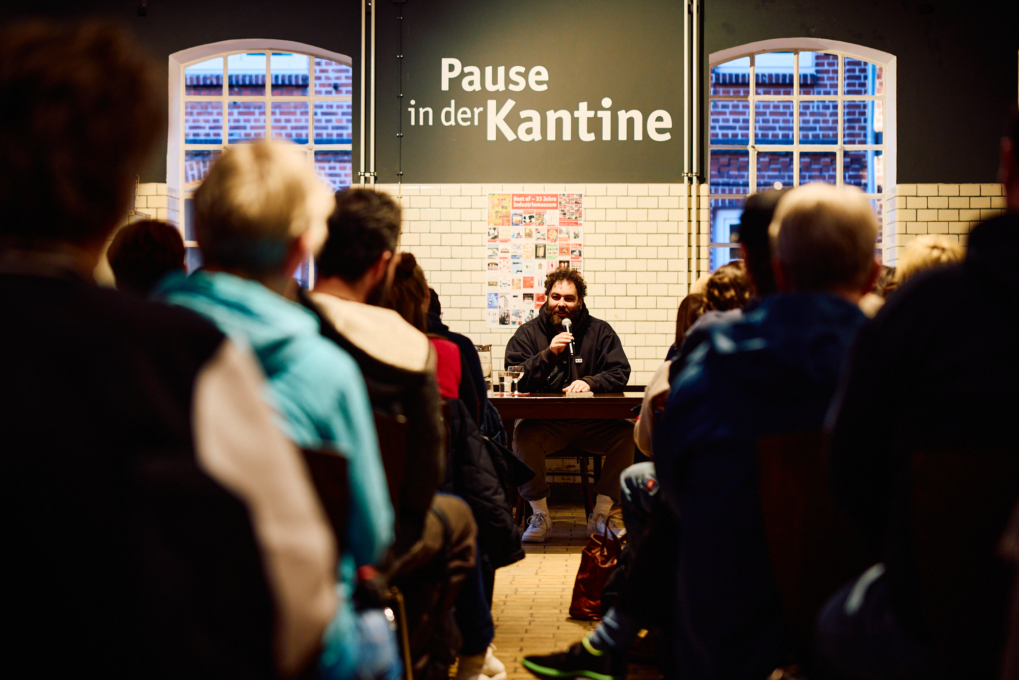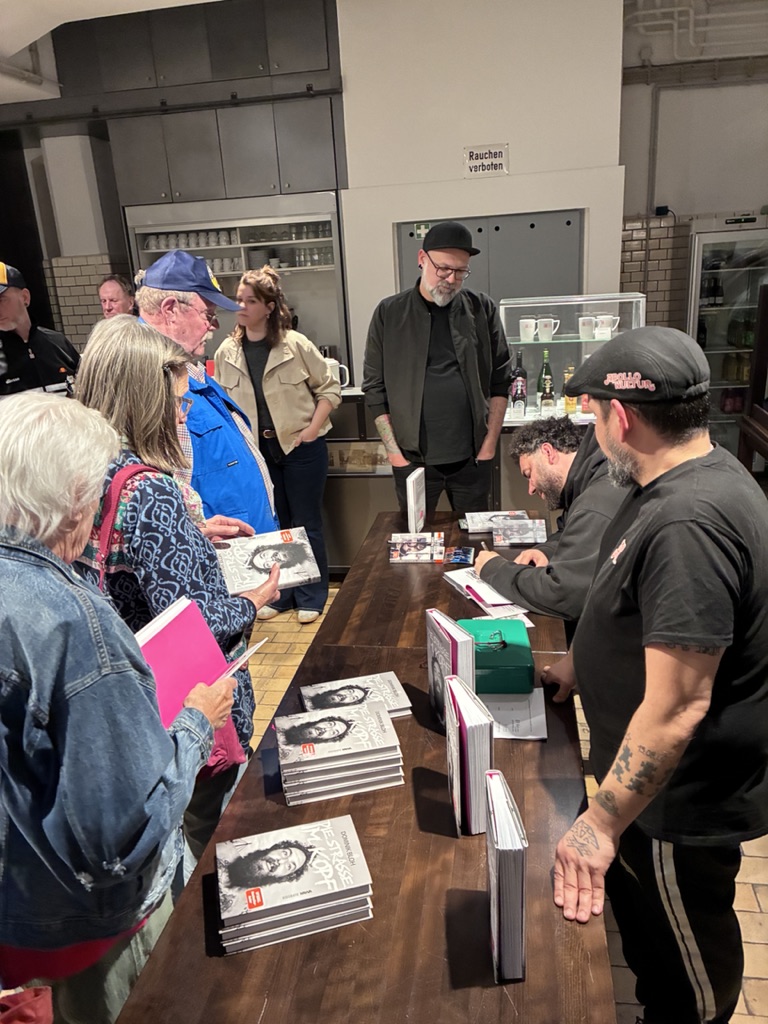 Viele Leute nutzten nach der Lesung die Gelegenheit, seine Bücher zu kaufen und von ihm signieren zu lassen. Im Anschluss an die zweite Lesung zogen sich Alex und Dörte von den Suppenhühnern noch mit Dominik für eine Podcast-Aufzeichnung ins Obergeschoss des Industriemuseums zurück. Ich durfte als stille Beobachterin dabei sein und zuhören, wie die drei über soziales Unternehmertum und den Nationalen Aktionsplan gegen Wohnungslosigkeit, aber auch persönliche Erinnerungen und Mutmach-Momente in Dominiks Leben sprachen. Die Aufzeichnung entstand unter Zeitdruck, weil das Personal des Industriemuseums eigentlich längst Feierabend hatte. Und die Mikrofone hielten auch nicht so recht an der Tischplatte. 😉 Mehr will ich hier gar nicht spoilern, denn demnächst erscheint die Podcastfolge als Auftakt zur zweiten Staffel von „Mission Possible“, dem Ehrenamts-Podcast der Elmshorner Suppenhühner. Reinhören lohnt auf jeden Fall!