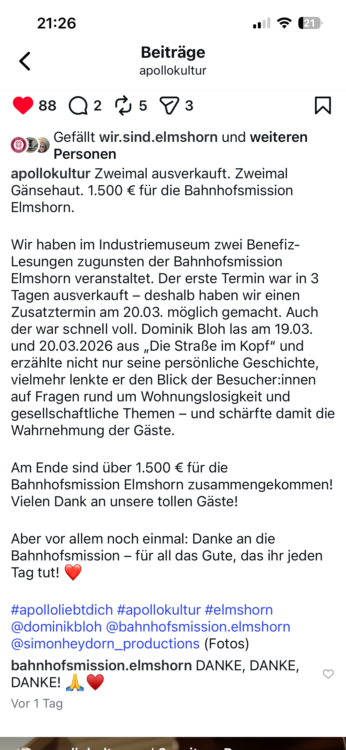 Inzwischen haben die Apollos Kassensturz gemacht und den Erlös der Benefiz-Veranstaltungen bekanntgegeben. Wie zuvor angekündigt, gehen sämtliche Einnahmen aus dem Ticketverkauf – in der Summe beachtliche 1.500 Euro – an die Bahnhofsmission, deren Arbeit für hilfebedürftige Menschen man gar nicht genug wertschätzen kann. Und ich… bin jetzt mehr denn je froh, dass ich die Idee hatte, Dominik nach Elmshorn einzuladen. Dass sie bei allen Beteiligten auf so fruchtbaren Boden gefallen ist und letztlich in diese beiden tollen Veranstaltungen mündete. Danke an alle, die dabei waren, an einem Strang gezogen und sie möglich gemacht haben! ❤